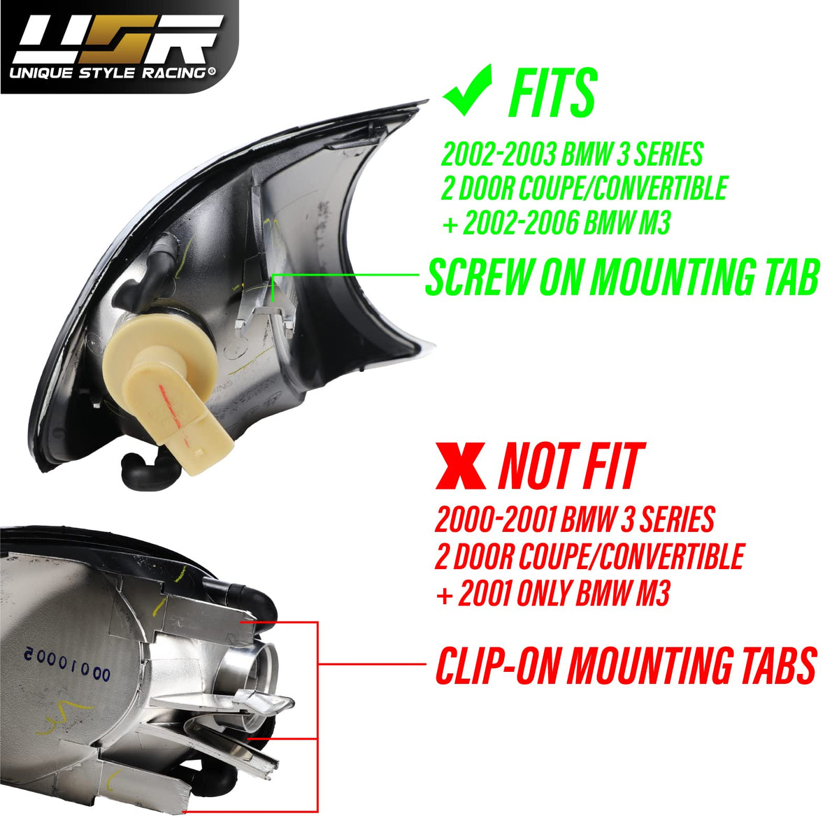 Please Note - These Corner Lights Fit For 2002-2003 Bmw E46 3 Series 2 Door Coupe And Convertible And 2002-2006 E46 M3 Which Comes With Screw-On Version Of Corner Light. This Will Not Fit On A Clip-On Corner Light Type. Please Make Sure You Purchase The Correct Setup Or It Would Not Fit.