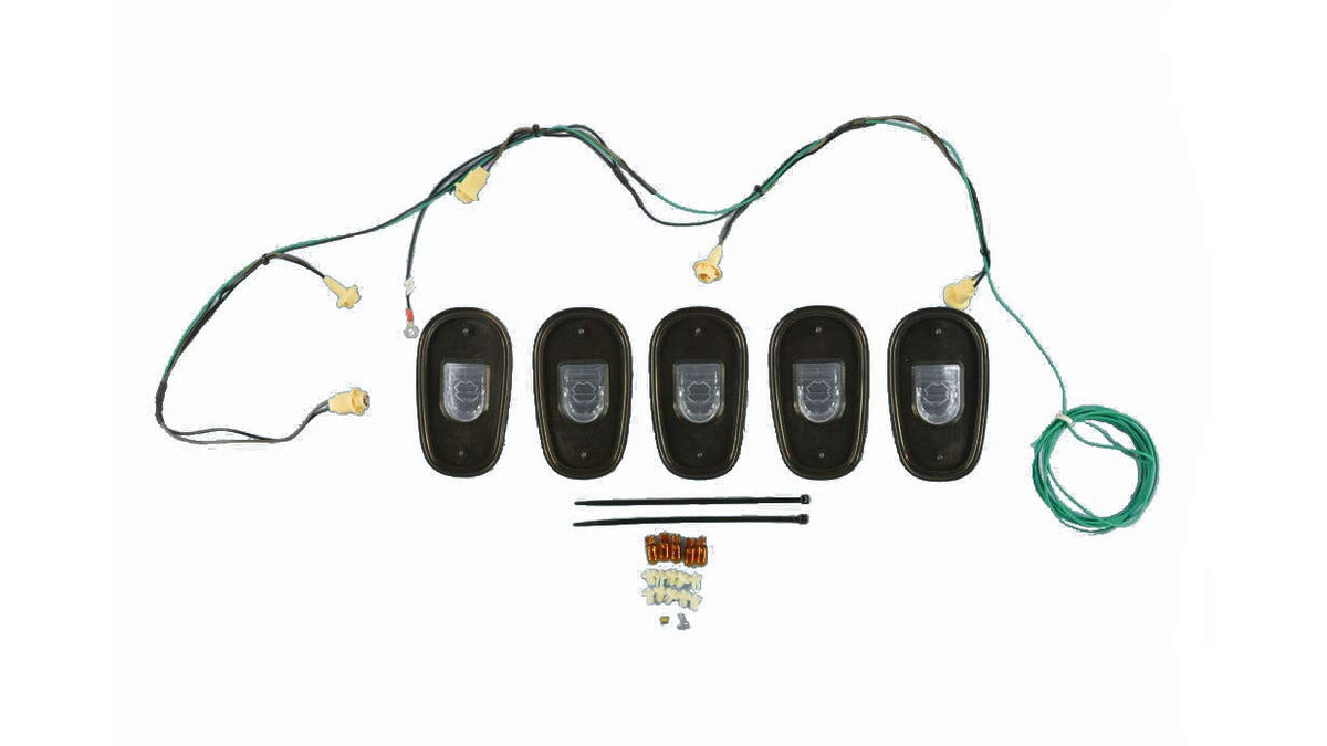 Q: What is included in the Roof Cab Clearance Lamps Light Kit?A: The kit includes a set of 5 clear lens lights with amber bulbs, necessary wiring, installation instructions, and an application template for easy setup.