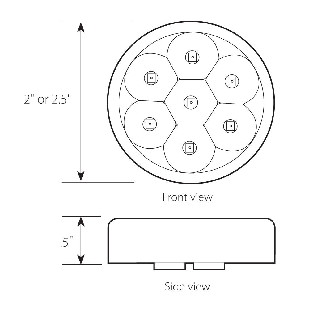 DescriptionGrand General's premium quality pearl LED lights are a great choice to dress up your ride with bright LEDs. Each individual diode has a round pearl-shaped reflector giving the light a clean, custom look and superior light distribution. LEDs are brighter and have lower amperage draw making it possible to add more lighting without upgrading your charging system. 2 inches round lights are a commonly used size in heavy and medium duty trucks. This amber 2 inches round LED is used for marker/clearance functions and uses a standard 2-prong pigtail. It is LED is DOT (Department of Transportation) compliant for street legal lighting and is an excellent choice to upgrade your ride.