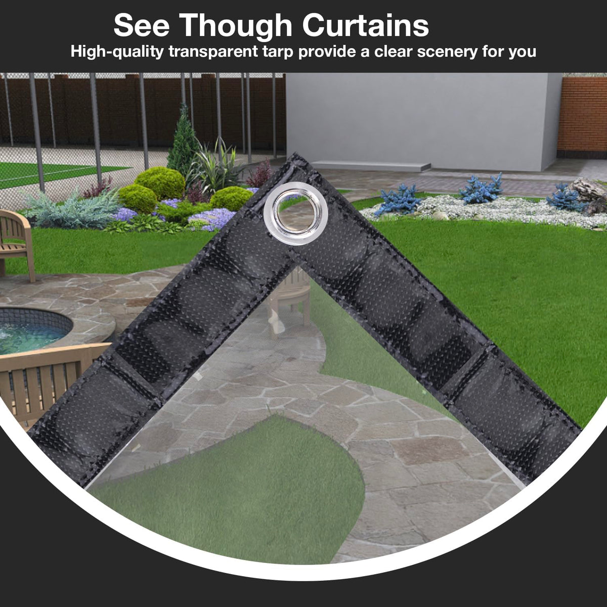 Usage: Clear Tarps Waterproof are made of Heavy Duty PVC, weighing about 15oz, with a thickness of 0.3mm and reinforced at the edges of the tarpaulin to prevent it from being torn, making it strong and durable, as well as waterproof, windproof and coldproof, and suitable for all seasons of the year. Compared with tarpaulins with color, the clear tarpaulins waterproof can receive light while keeping heat in, so that the inside of the tarpaulin is no longer dark. The self-contained eyelets and ropes allow you to no longer suffer from the tedious installation work, easy installation, so you can quickly enjoy the comfort brought by the tarp. A variety of occasions for you to use, whether it is a balcony, gazebo or flower house, the tarpaulins are your the most suitable products for you.