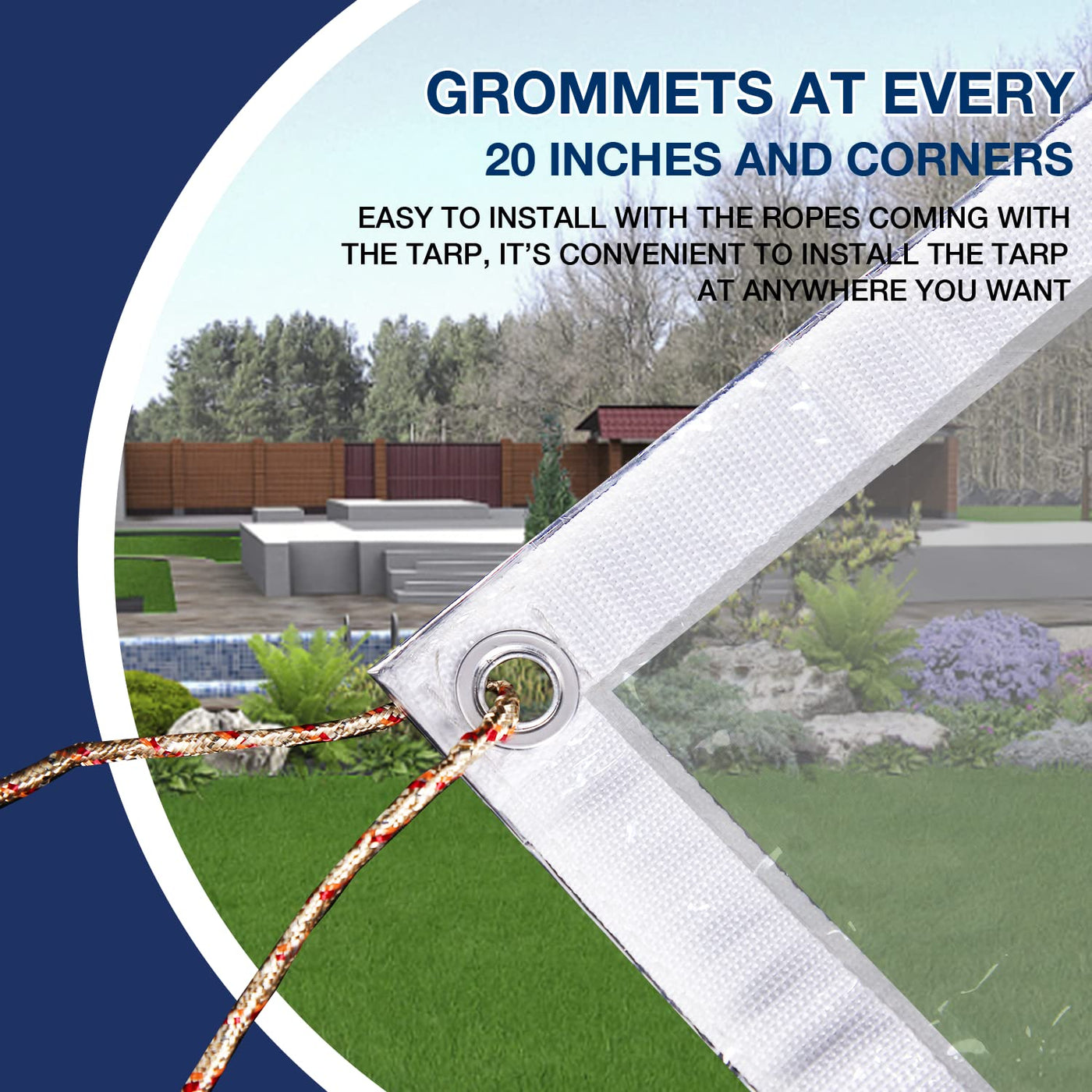 Tough Material: This PVC Clear Tarp consists of 15-mil thick material. We use rustproof aluminium eyelets every each corner and reinforced eyelets on four edges, four edges use six stitching makes it durable and long service life. | Easy to Install: These tarps come with aluminium eyelets every 50 cm and corners. And with these even a child can easily install these tarpaulin.You can tie these tarps down securely. | High-Quality and Various Sizes: the sheeting can be bent and folded at will, it blocks UV rays and there are a large number of different size available, suitable for indoor and outdoor use. | Transparent Tarpaulin: This tarpaulin is suitable for hanging on the patio, porch or balcony in winter, which can keep out cold rain and snow. It's thick but transparent, still allowing light. You can see the outdoor scenery without going out. | Multi Versatility: Our clear cover is also suitable for covering chicken coop , pet Hutch, barns, kennels,farm, garage, also suit for cover furniture, swimming pool, landscaping, painting, camping, cars etc.