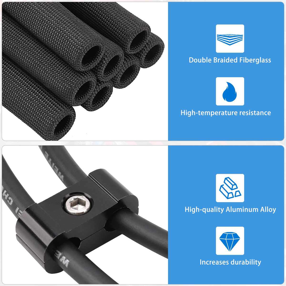 Q: What materials are used in the spark plug wire separator and boots?A: The spark plug wire separator is made of high-quality aluminum alloy, ensuring durability and lightweight performance. The heat shield sleeves are crafted from double braided fiberglass, known for its flame retardancy and high-temperature resistance.