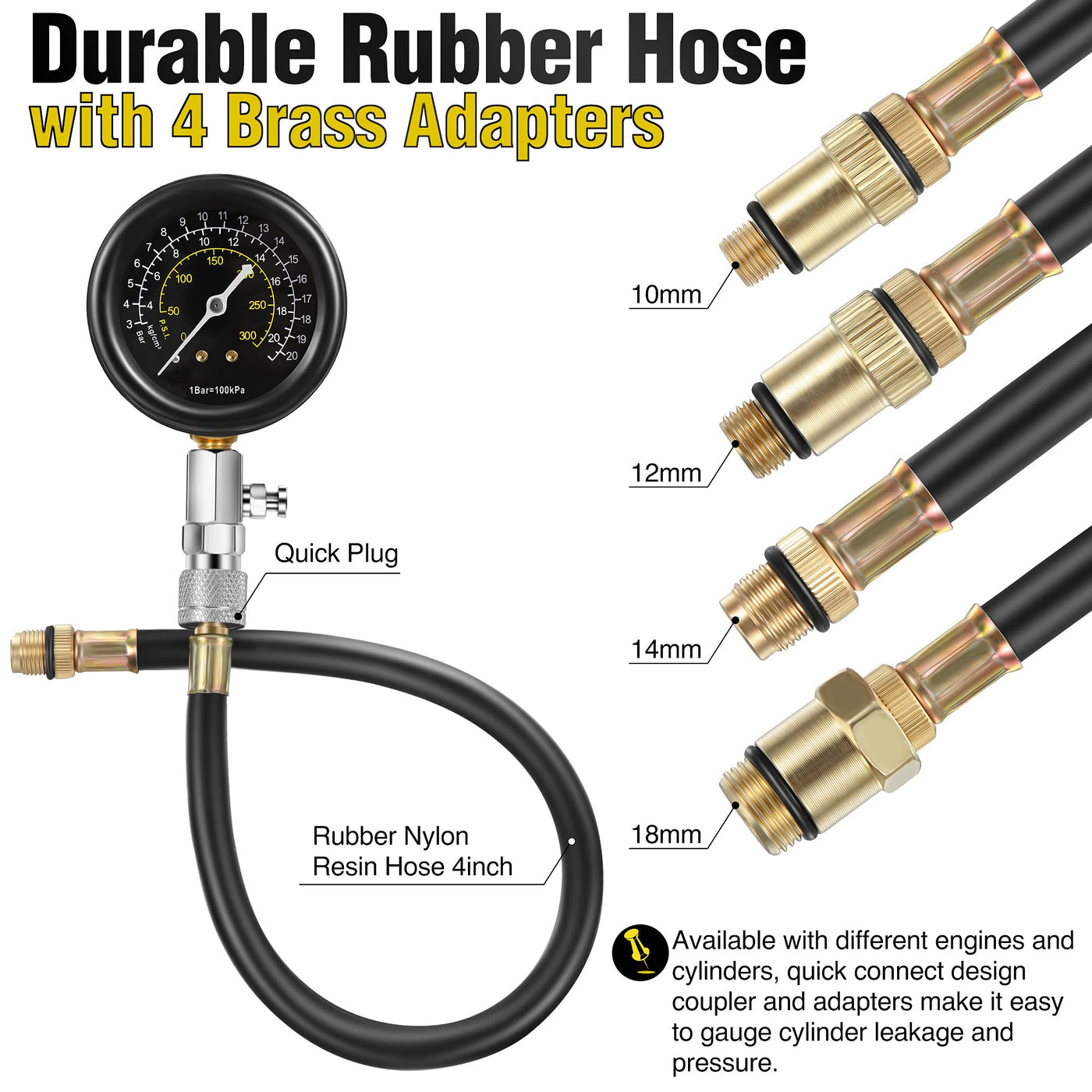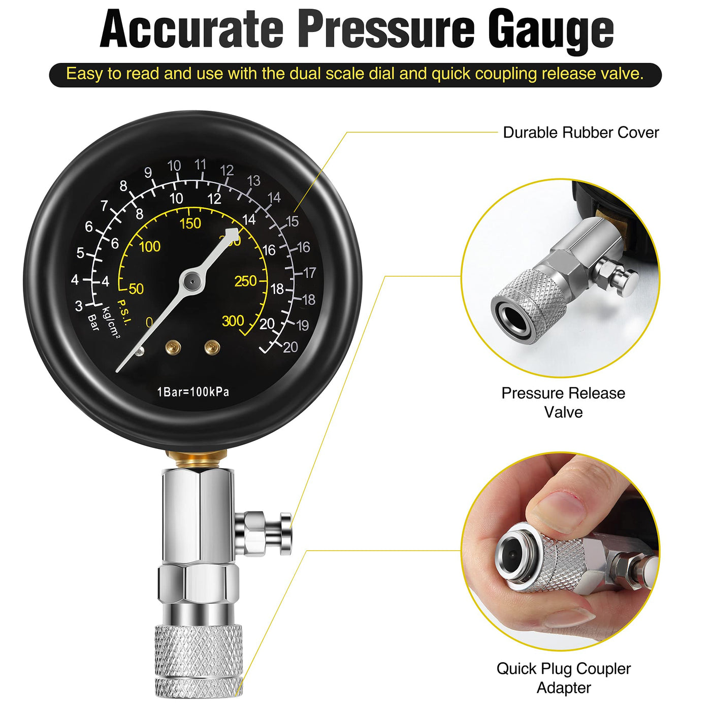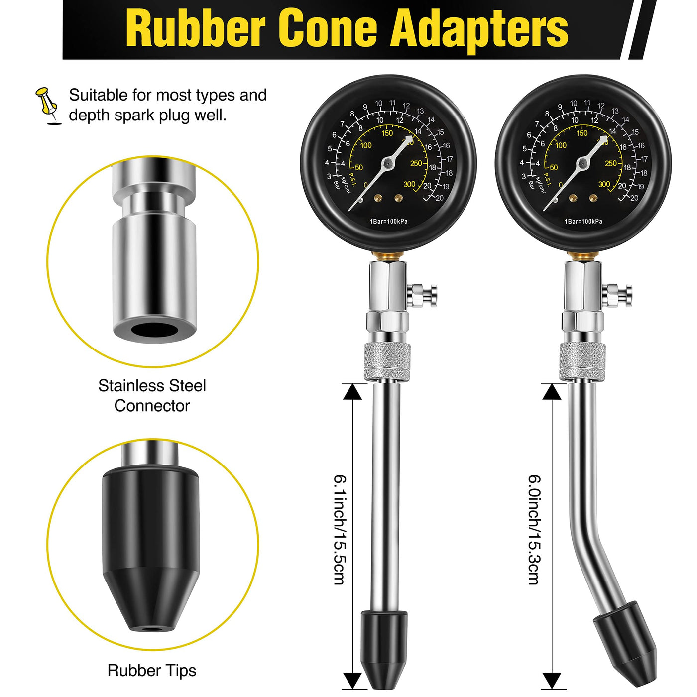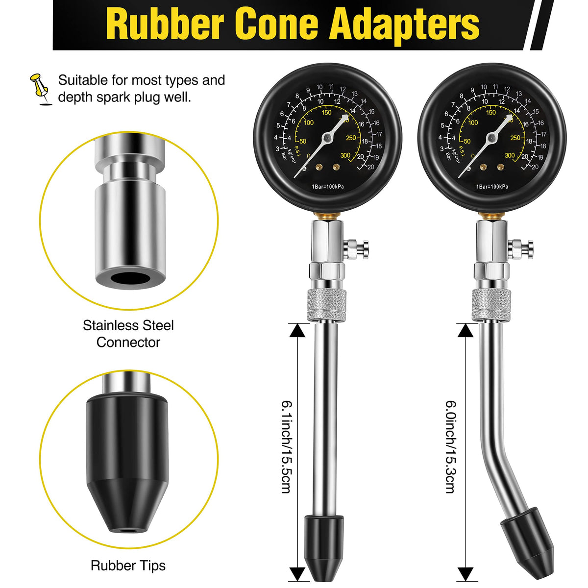 Cylinder Compression Tester Kit And Engine Ignition Tester Easy To Gauge And Safe To Test All Tools You Need Are Included In A Kit, The Better They Help You To Gauge The Cars Condition A Nice Engine Tester Can Help You With This: Reveals Engine Condition Preventive Maintenance Early Problem Detection Why Choose Us: Extra Spark Plug Tester Included Quality Materials Easy To Read Instrument Panel For Universal Cars And Internal And External Engine Package List: 1 X 300Psi 20Bar Pressure Gauge With Quick Coupler 1 X Spark Plug Tester 1 X 6 Inch Long Straight Push-On Connector 1 X 6 Inch Long Curved Push-On Connector 1 X 16 Inch Rubber Resin Hose With 14 Mm Adapter 1 X 10 Mm X 10 Adapter 1 X 12 Mm X 125 Adapter 1 X 14 Mm X 125 Adapter 1 X 18 Mm X 15 Adapter 2 X Instructions 1 X Storage Blow Molding Suitcase Note: 1 Please Make Sure That All Parts Are Well Installed Before Proceeding To The Cylinder Pressure Test In Case Of Leakage Or Inaccurate 2 Do Not Touch Any Of The Spark Plug Tester Or Any Part Of The Test Units When The Ignition Is On