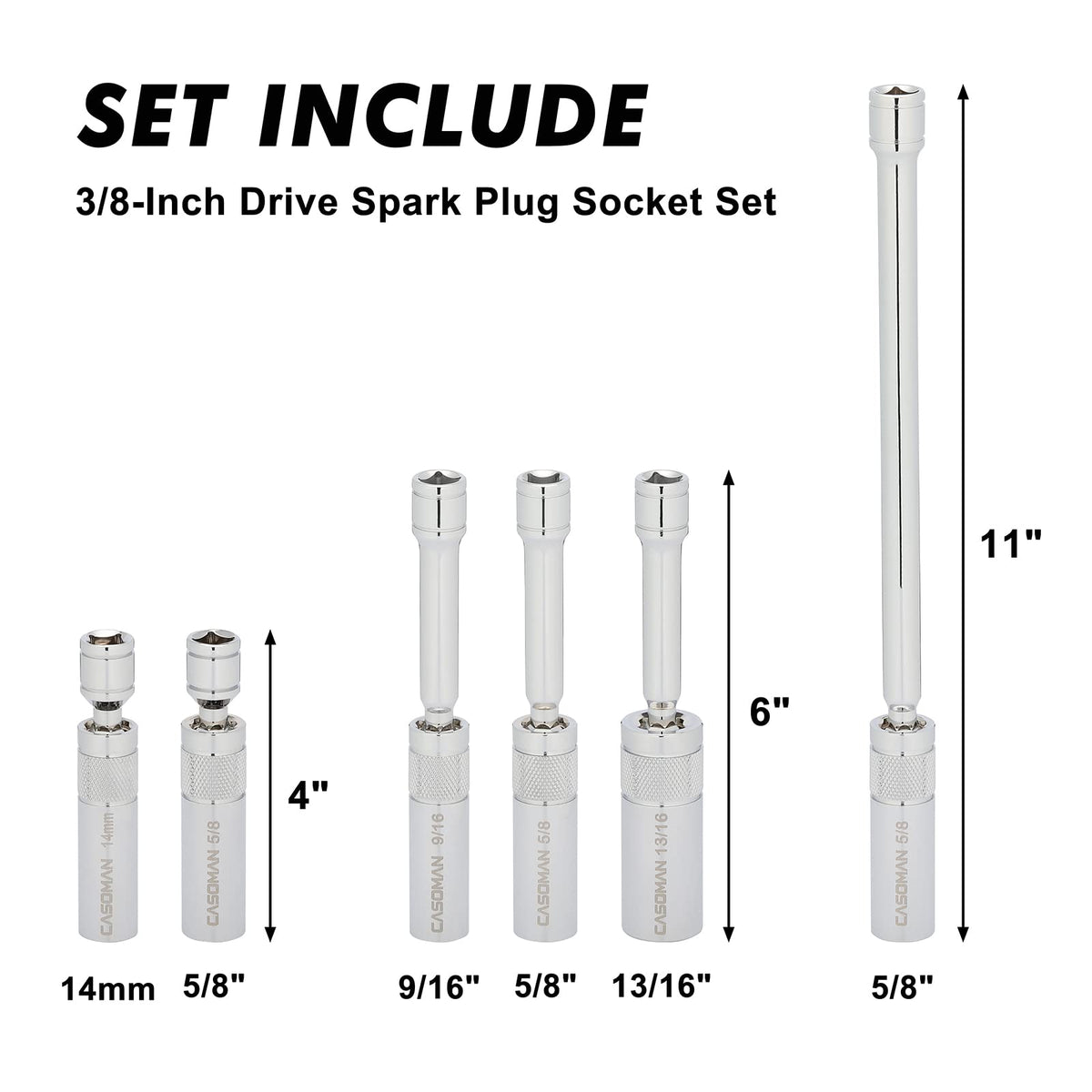 The Casoman 6Pcs 38-Inch Drive Magnetic Swivel Spark Plug Socket Set, Include 916-Inch, 58-Inch, 1316-Inch, 14Mm Socket, Length: 4-Inch, 6-Inch, 11-Inch, 12-Point, Cr-V, Manufactured From Heavy-Duty Chrome-Vanadium Steel Alloy (50Bv30) With Corrosion-Resistant Mirror Chrome Finish 38-Inch Drive Magnetic Spark Plug Socket Set Include: 916-Inch, 58-Inch, 1316-Inch, 14Mm Socket, Total Length: 4 Inch, 6 Inch, And 11Inch The Spark Plug Socket Has 360 Degree Swivel Action For Maximum Flexibility, 12-Point Design For Enhanced Gripping Power
