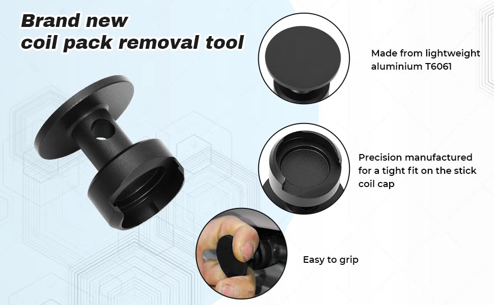 Q: How does the design of this tool enhance its usability?A: This coil removal tool features a precision-manufactured design that provides a tight fit on the stick coil cap. It includes a large flange handle for a secure grip and a hole in the handle for better leverage with a slender tool, ensuring safe and easy removal of stick coils.