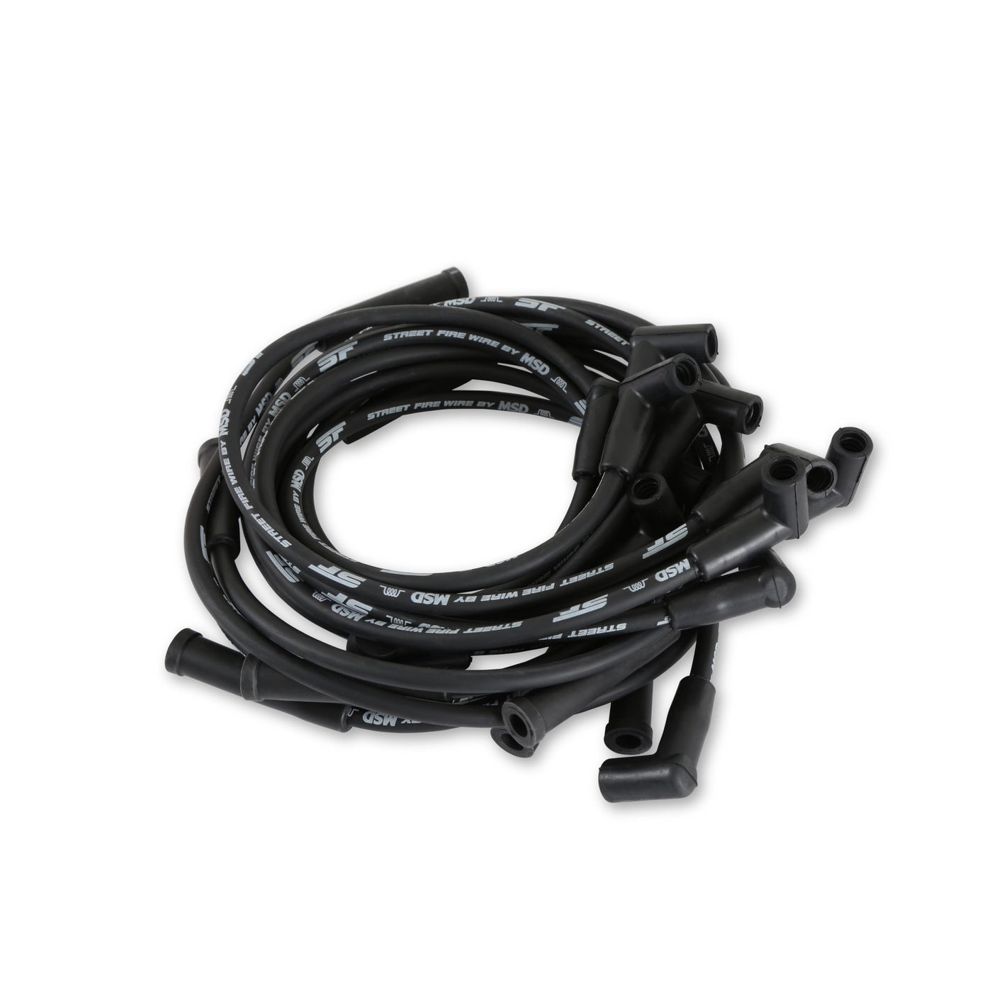 The street fire spark plug wires feature a low resistance conductor that's wrapped in a sleek and durable black sleeve. The terminals are covered in black boots that protect the conductor from engine heat to ensure spark delivery.