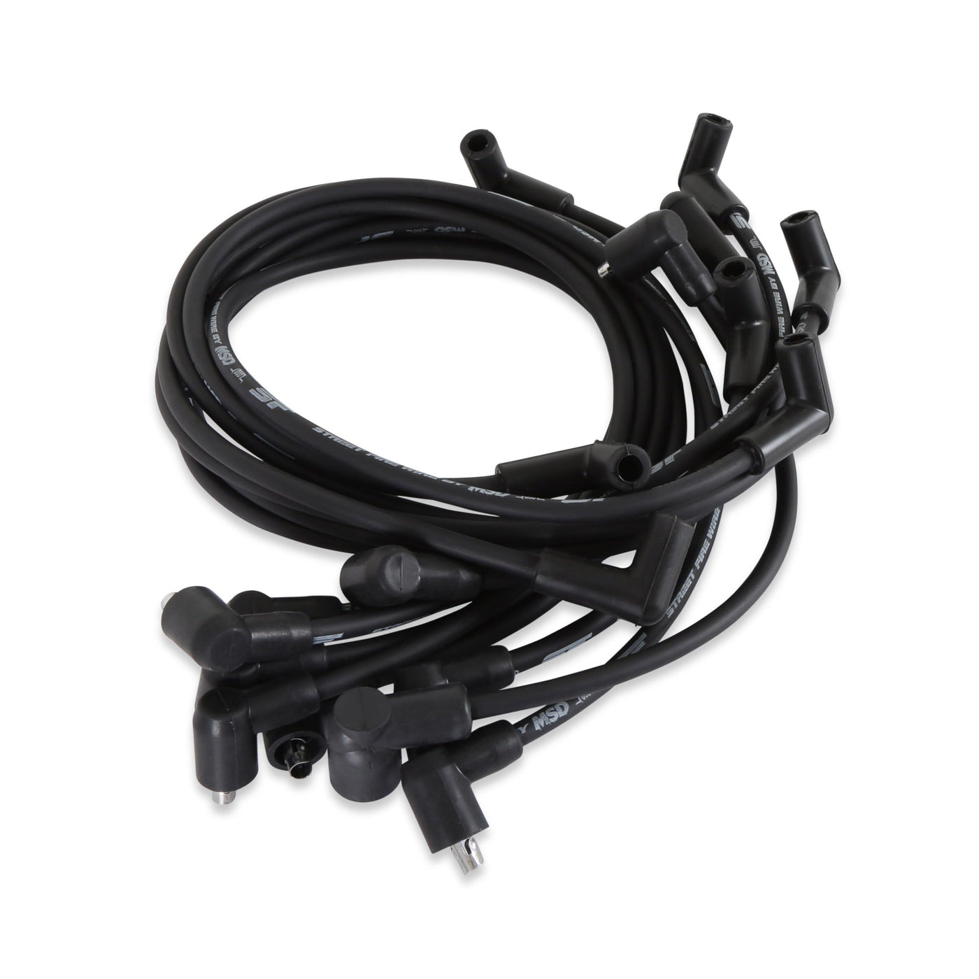 The street fire spark plug wires feature a low resistance conductor that's wrapped in a sleek and durable black sleeve. The terminals are covered in black boots that protect the conductor from engine heat to ensure spark delivery.