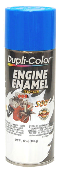 Dupli-Color Engine Enamel Spray Paint that contains Ceramic resins for maximum heat dissipation and gloss retention. The resins offer protection from exposure to excessive heat and automotive fluids. This Ford Blue paint color is known for its durability; it resists temperatures up to 500°F intermittently and produces a finish that will not blister, flake, crack or peel. Featuring an EZ Touch Conical Nozzle, this spray paint for cars, trucks and SUVs is easy to use and ensures maximum coverage on engine blocks and engine accessories to give you desired results. Excellent for under-the-hood applications in vehicles, this Dupli-Color high heat spray paint will perform to the most rigorous standards of racing, street rod, and vehicle restoration enthusiasts. Dupli-Color features a large selection of Engine Enamels, from primers to color to clear coats. Before using Engine Enamel, clean and prep surfaces with Dupli-Color Prep Spray. Lay down a topcoat of the Engine Enamel primer. Once dry, lay down 2 light coats, followed by 1 medium coat of Engine Enamel with Ceramic in the desired color, for complete coverage.