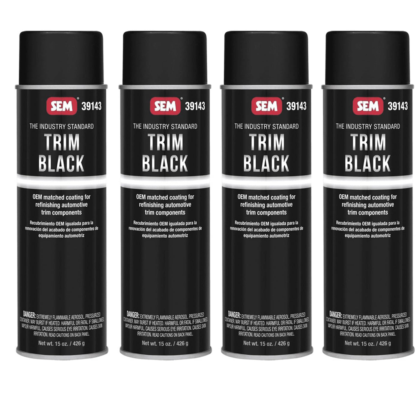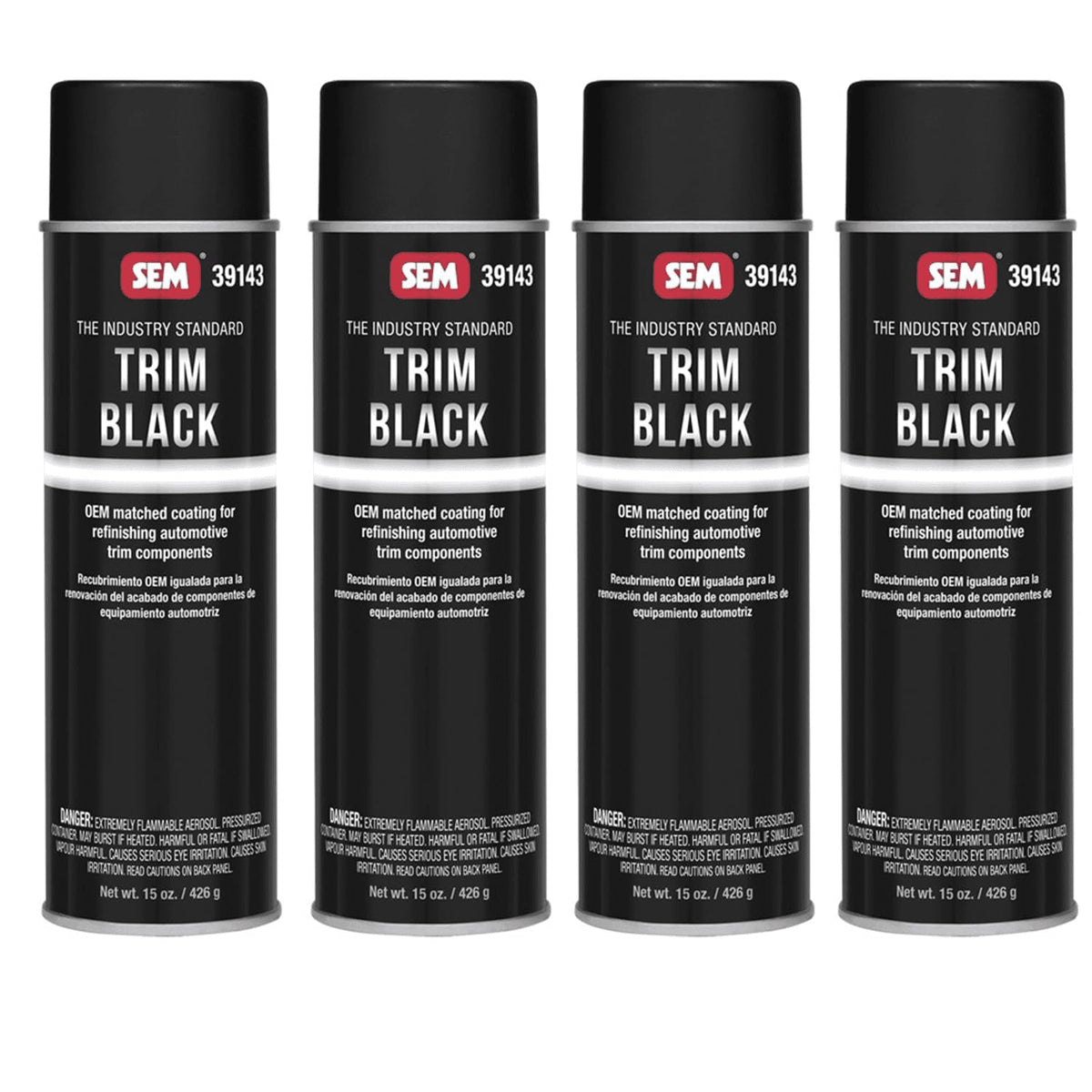 15 Oz Aerosol Satin Gloss Level Matches factory finish on many automotive exterior trim components. No primer needed for adhesion. SEM Trim Paint Surface Preparation: Wash the part thoroughly with 39362 SEM Soap. Clean with good quality Grease and Wax remover such as SEM 38373. Sand with 400 grit sandpaper and reclean with G&W remover. Mask off all areas not to be coated to protect from overspray. Apply light mist coats evenly allowing 5-10 minutes between coats. Several thin coats are better than 1 heavy coat. Salesman Note: Don't rush to install the part. Trim Paint adhesion improves with time. Full hardness and maximum adhesion should be obtained in about 48 hours. Warning: This product can expose you to chemicals which is [are] known to the State of California to cause cancer and birth defects or other reproductive harm.