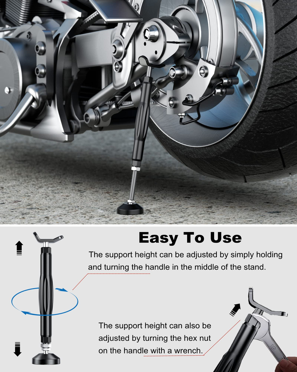 Q: How does the BRCOVAN Motorcycle Stand work?A: The BRCOVAN Motorcycle Stand is designed for easy operation. Simply hold and turn the handle in the middle of the stand with one hand to adjust the height, which ranges from 245mm to 400mm. After setting the desired height, secure it by adjusting the large hexagonal nut at the bottom of the stand, ensuring a strong support without the need for additional tools.