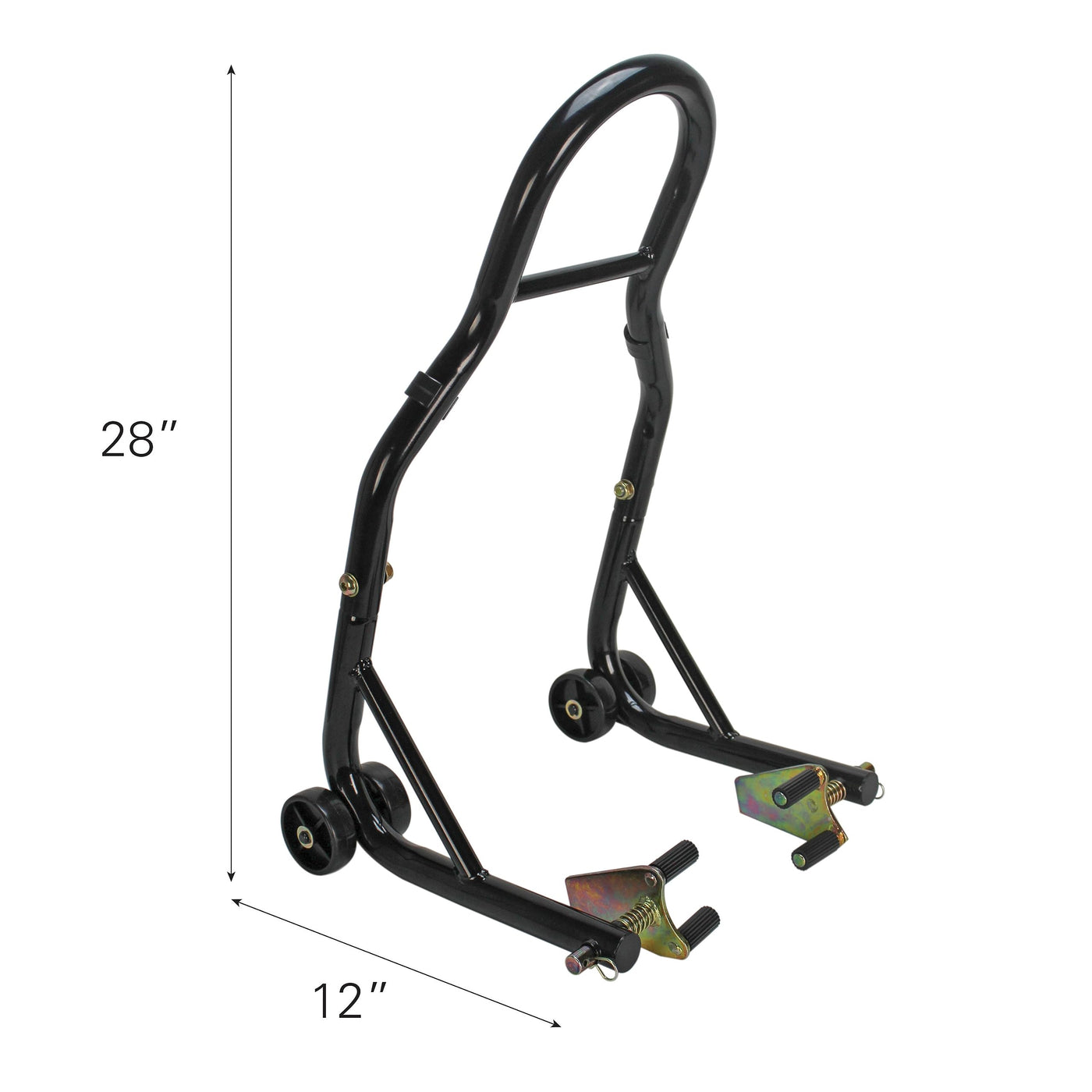 Lifting your sport bike for maintenance or storage is easier than ever with the Sport Bike Motorcycle Front and Rear Lift Stand from Extreme Max Products. Consisting of two individual lifts that work separately or as a unit, the front lift stand nestles underneath your front wheel forks, cushioned with rubber padding that will not scratch your forks, while the rear lift stand cradles your dual-side swing arm spools (not included), getting your bike off the ground and into the perfect position for maintenance, repair or storage. Each stand features a substantial width adjustment, creating a custom fit for nearly any sport bike; the front mounting fork width expands from 9.5'' to 12.5'' while the rear spool attachment opens from 10.75'' to 13.5''. As possibly its best feature, the lift stands are incredibly easy to use. Once you know the width measurement of your forks and spools, lock the stands into the matching width. From there, wheel the stands into position and simply lower the handle down for a nice, smooth lift. The handle then becomes the stand's base, wide enough to maintain stability and strong enough to never sag. Note: Swing arm spools are required for use with the rear lift stand and are not included. Extreme Max recommends that all bikes be secured to the stands with straps while lifted as an additional safety measure.