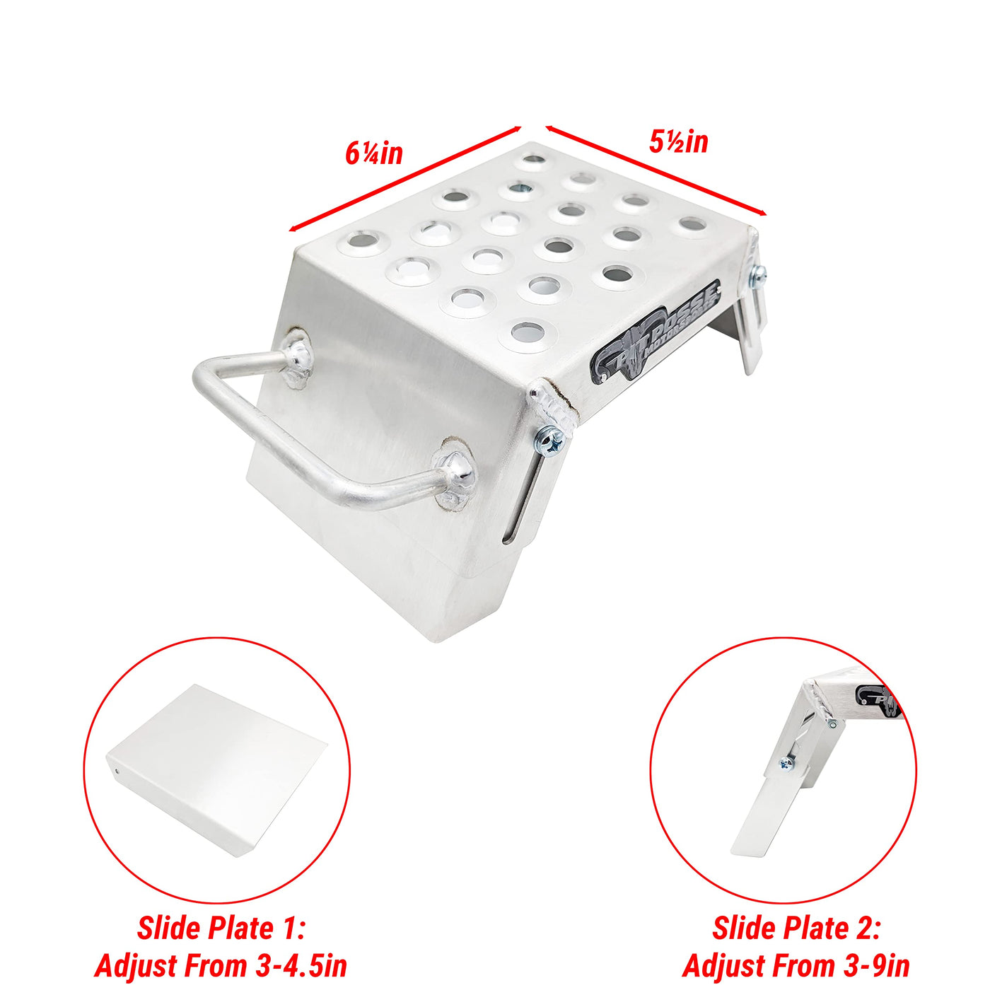 ?Proudly engineered and manufactured in the USA!?Blocks adjust from 3-9 Inches tall?Sold as a pair?Cheese grate surface works for cleaning mud off boot bottoms?Made from high quality aircraft aluminum?Blocks are stackable with a single carry handle