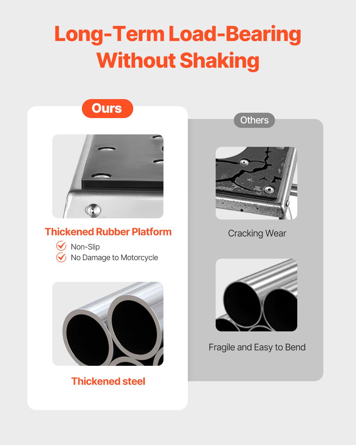 Lifts up to 16 Inches: Our pit bike stand has a support height of 16 inches, allowing you to lift the dirt bike off the ground for easy maintenance, cleaning, and other tasks | Upgraded 1100 lbs Load Capacity: This dirt bike stand has an upgraded load capacity of up to 1100 lbs, capable of supporting most motorcycles, including models from Yamaha, Kawasaki, Honda, Suzuki, and more. Important Note: Please measure the minimum ground clearance of your bike's engine to ensure it does not exceed the stand's maximum height | Stable and Strong: Our mini bike stand is made from heavy-duty steel with thickened walls, ensuring it won
