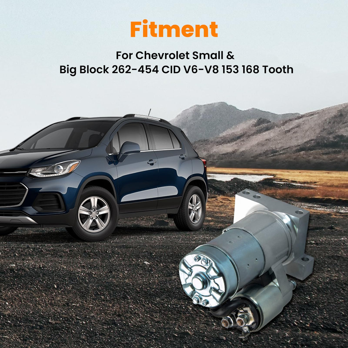 Q: What vehicles are compatible with the maXpeedingrods High Torque Mini Starter 19695?A: The maXpeedingrods High Torque Mini Starter 19695 is compatible with various Chevy V8 Small and Big Block engines, as well as V6 engines that use a 153 or 168 Tooth Ring Gear. It fits models such as the Chevrolet Astro (1985-2002), Bel Air (1970-1975), Biscayne (1970-1972), and Blazer (1973-1999).