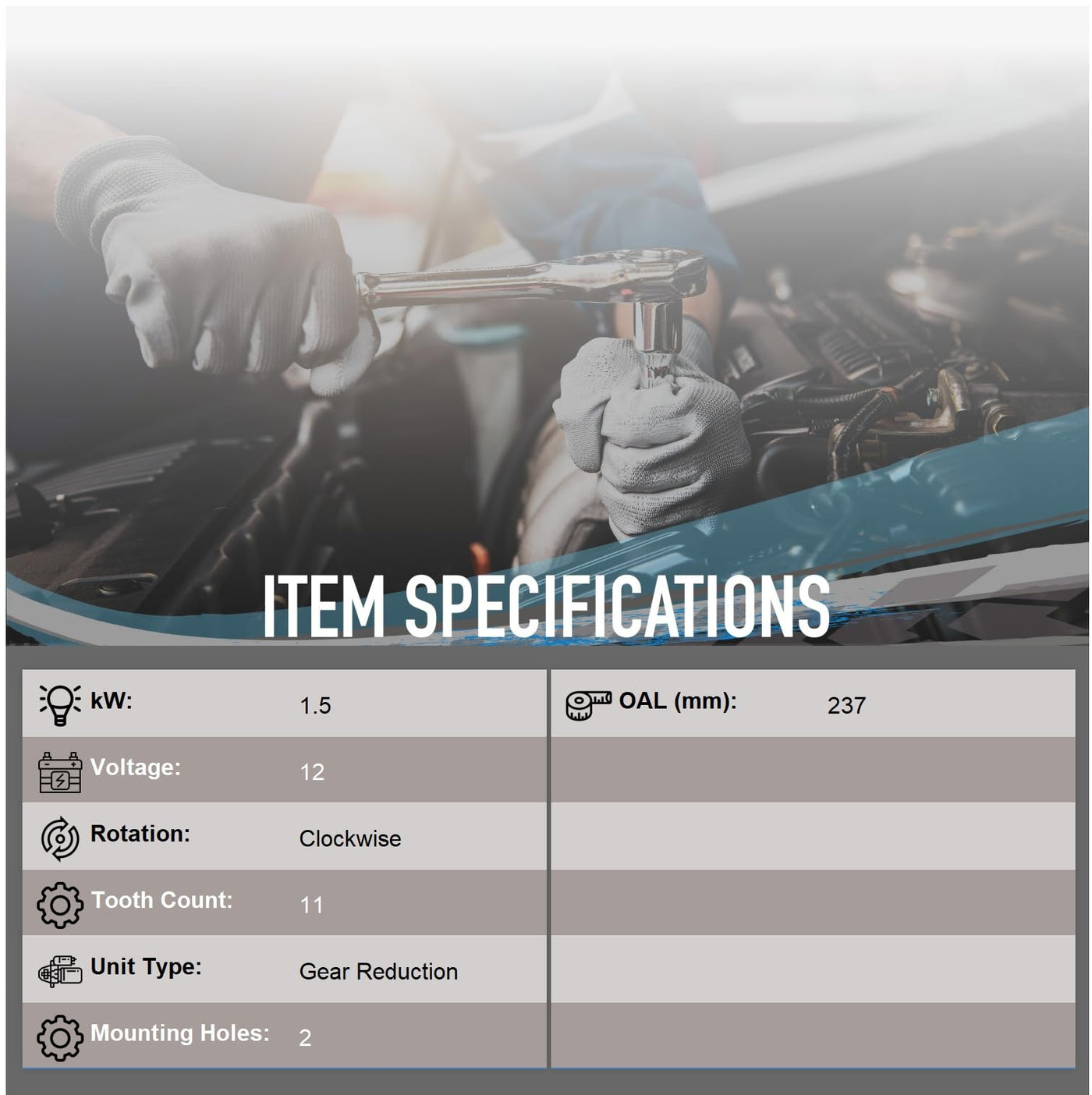 SPECIFICATIONS: 1.5kW/12 Volt, CW, 11-Tooth Pinion UNIT TYPE: PG260G PMGR SERIES: PG260G DESIGN: PMGR VOLTAGE: 12 KW: 1.5 ROTATION: CW NUMBER OF TEETH: 11 NOTE 1: Also replaces PG260F2 Starters: 9000842, 12560672 ( 6488) with short inboard mtg. bolt, however 6489N will require the included 85-1507 M10 x 1.50 x 113mm inboard mtg. bolt NOTE 2: Also replaces PG260F2 Starters: 9000854 ( 6489) FEATURE 2: OE performance torque & output Please note the overall length of this unit is 237mm, with 11 teeth, and the power rating is 1.5kW. Because this unit is a Gear Reduction, it may not have the same tooth count as the unit you are replacing. If you are replacing a 6494 (1.1kW, 9 tooth) unit with this 6489 (1.5kW, 11 tooth) unit, please be sure that you have enough installation space. This 6489 unit is approximately 22cm longer than a 6494 unit. REPLACEMENT FOR or COMPATIBLE WITH ISUZU: Ascender V8 5.3L 03-03 REPLACEMENT FOR or COMPATIBLE WITH GMC: Yukon XL 1500 V8 5.3L 01-02 Yukon V8 5.3L 01-02 Yukon V8 4.8L 01-02 Sierra 1500 V8 5.3L 01-02 Sierra 1500 V8 4.8L 01-02 Savana 2500 V8 5.3L 03-03 Savana 2500 V8 4.8L 03-03 Savana 1500 V8 5.3L 03-03 Envoy XL V8 5.3L 03-03 REPLACEMENT FOR or COMPATIBLE WITH CHEVROLET: Tahoe V8 5.3L 01-02 Tahoe V8 4.8L 01-02 Suburban 1500 V8 5.3L 01-02 Silverado 1500 V8 5.3L 01-02 Silverado 1500 V8 4.8L 01-02 Express 2500 V8 5.3L 03-03 Express 2500 V8 4.8L 03-03 Express 1500 V8 5.3L 03-03 Avalanche 1500 V8 5.3L 02-02 REPLACEMENT FOR or COMPATIBLE WITH CADILLAC: Escalade V8 5.3L 02-02