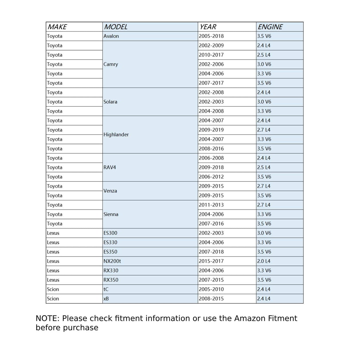 Q: What vehicles are compatible with this starter replacement?A: This starter replacement is compatible with V6 models of the 2002-2017 Toyota Camry, 2002-2008 Toyota Solara, 2004-2012 Toyota Sienna, 2006-2018 Toyota RAV4, 2004-2016 Toyota Highlander, and 2002-2012 Lexus ES300, RX330, RX350 with engine sizes of 2.4L, 3.0L, 3.5L, and 3.3L.