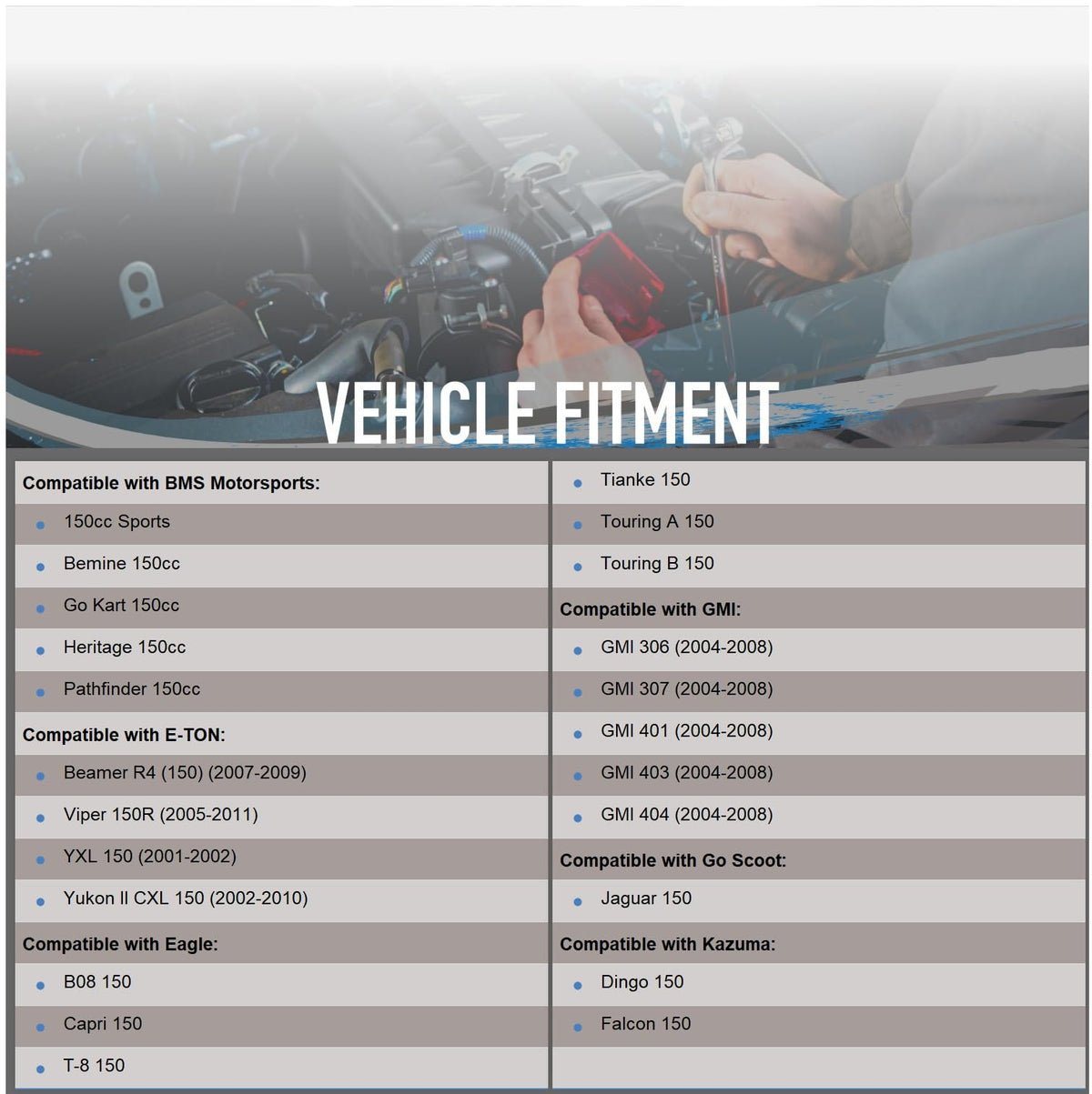 SPECIFICATIONS: 12 Volt, CW, 9-Tooth Pinion UNIT TYPE: PMDD DESIGN: PMDD VOLTAGE: 12 ROTATION: CW NUMBER OF TEETH: 9 COMPATIBLE WITH VENTO: GY6 multiple years COMPATIBLE WITH REDCAT MOTORS: VX 150 05-06 KMZ 150 05-05 COMPATIBLE WITH KAZUMA: Falcon 150 multiple years Dingo 150 multiple years COMPATIBLE WITH GMI: GMI 406 04-08 GMI 405 04-08 GMI 404 04-08 GMI 403 04-08 GMI 401 04-08 GMI 307 04-08 GMI 306 04-08 COMPATIBLE WITH EAGLE: Trail Master 150 multiple years Touring B 150 multiple years Touring A 150 multiple years Tianke 150 multiple years T-8 150 multiple years T-5 150 multiple years Sporty 150 multiple years Sport Utility 150 HW multiple years STI 150 multiple years ST 150 multiple years Rugged 150 multiple years Reaction 150 Auto multiple years Racer 150 multiple years Milano 150 multiple years Hanwei 150 multiple years GSR 150 multiple years GK150 multiple years Euro 150 multiple years Eagle 150 multiple years Carino 150 multiple years Capri 150 multiple years B08 150 multiple years COMPATIBLE WITH E-TON: Yukon II CXL 150 02-10 YXL 150 01-02 Viper 150R 05-11 Beamer R4 (150) 07-09 COMPATIBLE WITH BMS MOTORSPORTS: Teamguys 150cc multiple years Romans 150cc multiple years Robot 150cc multiple years Pinnacle 150cc multiple years Pathfinder 150cc multiple years Heritage 150cc multiple years Bemine 150cc multiple years Go Kart 150cc multiple years 150cc Sports multiple years COMPATIBLE WITH GO SCOOT: Jaguar 150 multiple years