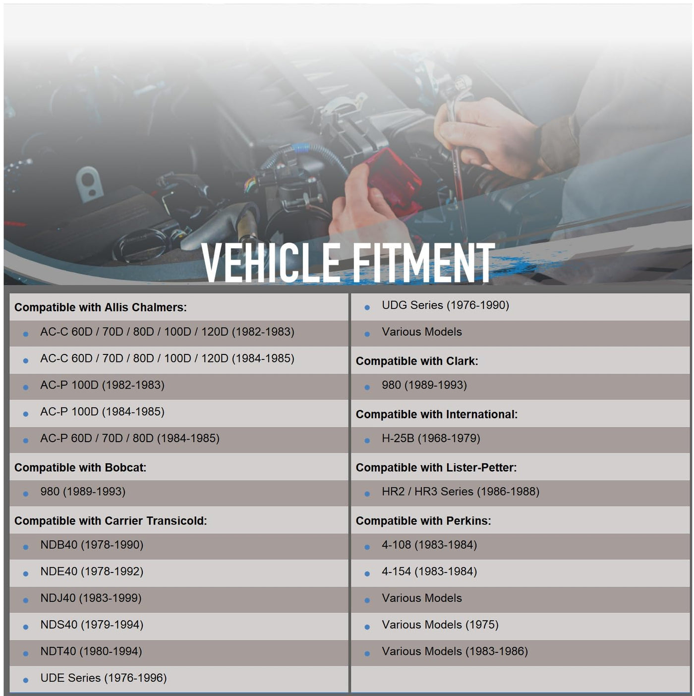 SPECIFICATIONS: 2.9kW/12 Volt, CW, 12-Tooth Pinion UNIT TYPE: 28MT OSGR SERIES: 28MT DESIGN: OSGR VOLTAGE: 12 KW: 2.9 ROTATION: CW NUMBER OF TEETH: 12 NOTE 1: Also replaces 22-27MT series 1109272, 1998334, 1998338, 1998378 FEATURE 2: Dry clutch REPLACEMENT FOR or COMPATIBLE WITH WAUKESHA: 4-220D 79-90 REPLACEMENT FOR or COMPATIBLE WITH VERSATILE: 4400 78-84 160 80-85 REPLACEMENT FOR or COMPATIBLE WITH PERKINS: Various Models multiple years 4-154 83-84 4-108 83-84 REPLACEMENT FOR or COMPATIBLE WITH LISTER-PETTER: HR2 / HR3 Series 86-88 REPLACEMENT FOR or COMPATIBLE WITH INTERNATIONAL: H-25B 68-79 REPLACEMENT FOR or COMPATIBLE WITH CLARK: 980 89-93 REPLACEMENT FOR or COMPATIBLE WITH CARRIER TRANSICOLD: Various Models multiple years UDG Series 76-90 UDE Series 76-96 NDT40 80-94 NDS40 79-94 NDJ40 83-99 NDE40 78-92 NDB40 78-90 REPLACEMENT FOR or COMPATIBLE WITH BOBCAT: 980 89-93 REPLACEMENT FOR or COMPATIBLE WITH ALLIS CHALMERS: AC-P 60D / 70D / 80D 82-85 AC-P 100D 82-85 AC-C 60D / 70D / 80D / 100D / 120D 82-85