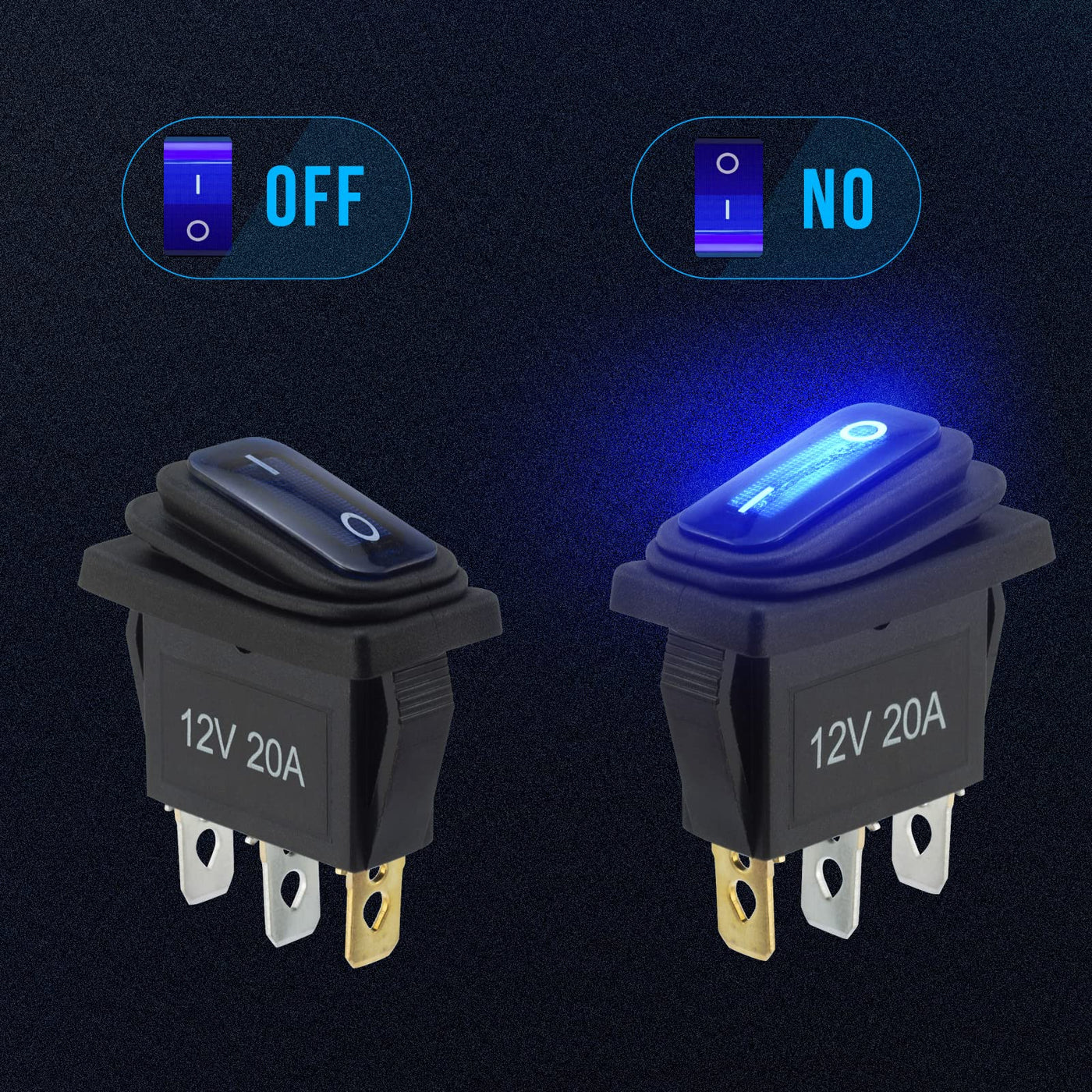 12V Dash Switch Feature Type: 3 Pins With Led Spst: On-Off Led Color: Blue Waterproof: Ip65 Switch Type: Toggle Switch , Rocker Switch , On Off Switch, 12V Light Switch, Marine Switch Input: 12V-24V Dc Hole Diameter:20Mm/0.8' Wire Length: 200Mm/ 7.8'