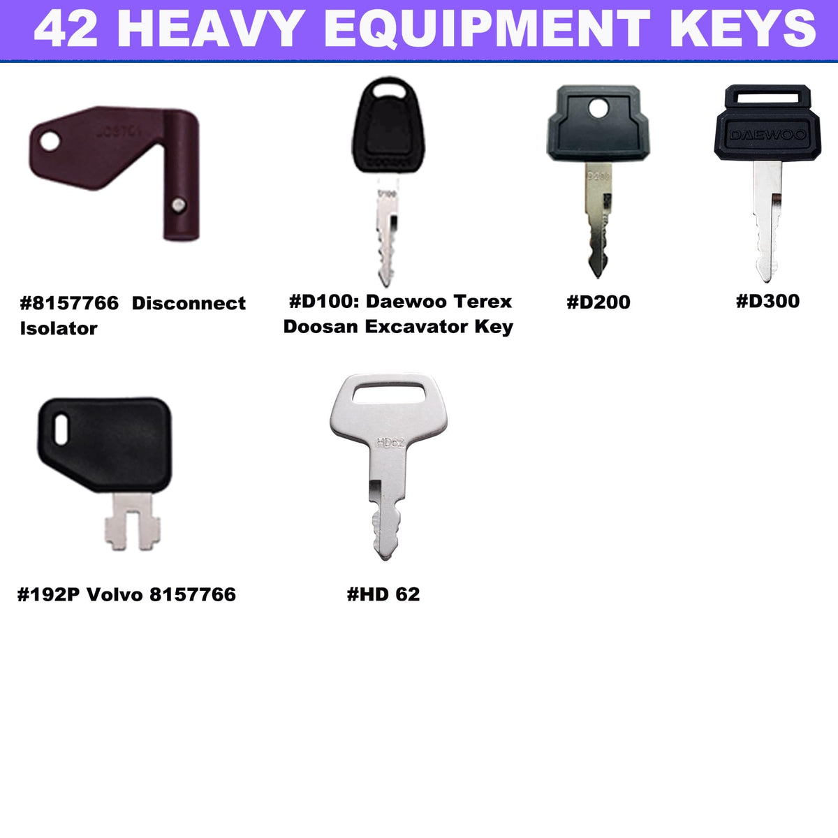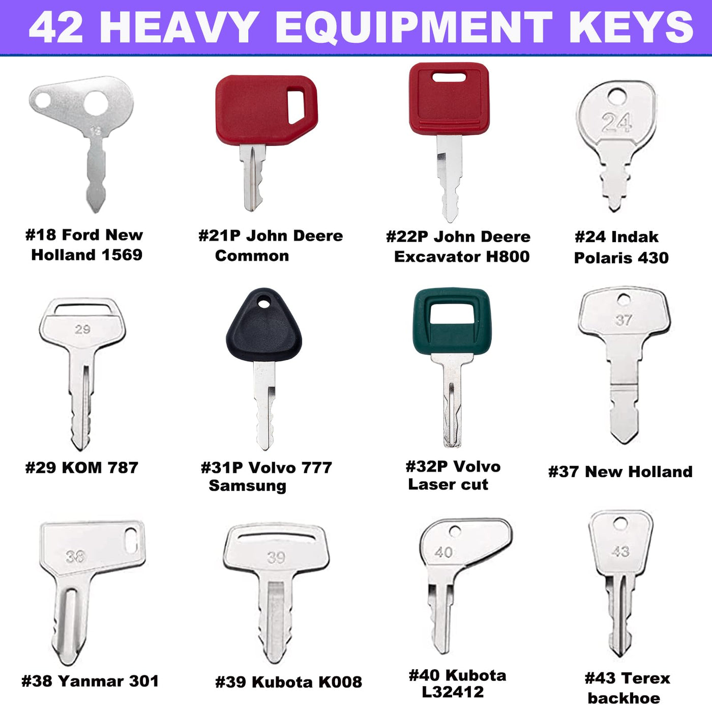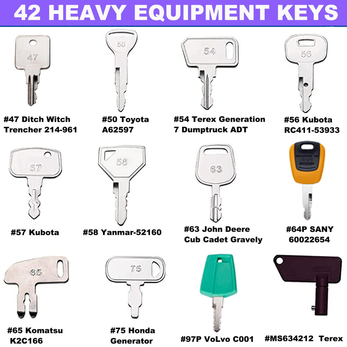 Q: What types of heavy equipment are compatible with the 42 Heavy Equipment Keys Master Set?A: The 42 Heavy Equipment Keys Master Set is compatible with a wide range of heavy equipment, including excavators, loaders, backhoes, tractors, dump trucks, bulldozers, and forklifts. It fits equipment from brands such as Caterpillar, Bobcat, Komatsu, JD, Case, JLG, JCB, and many others.