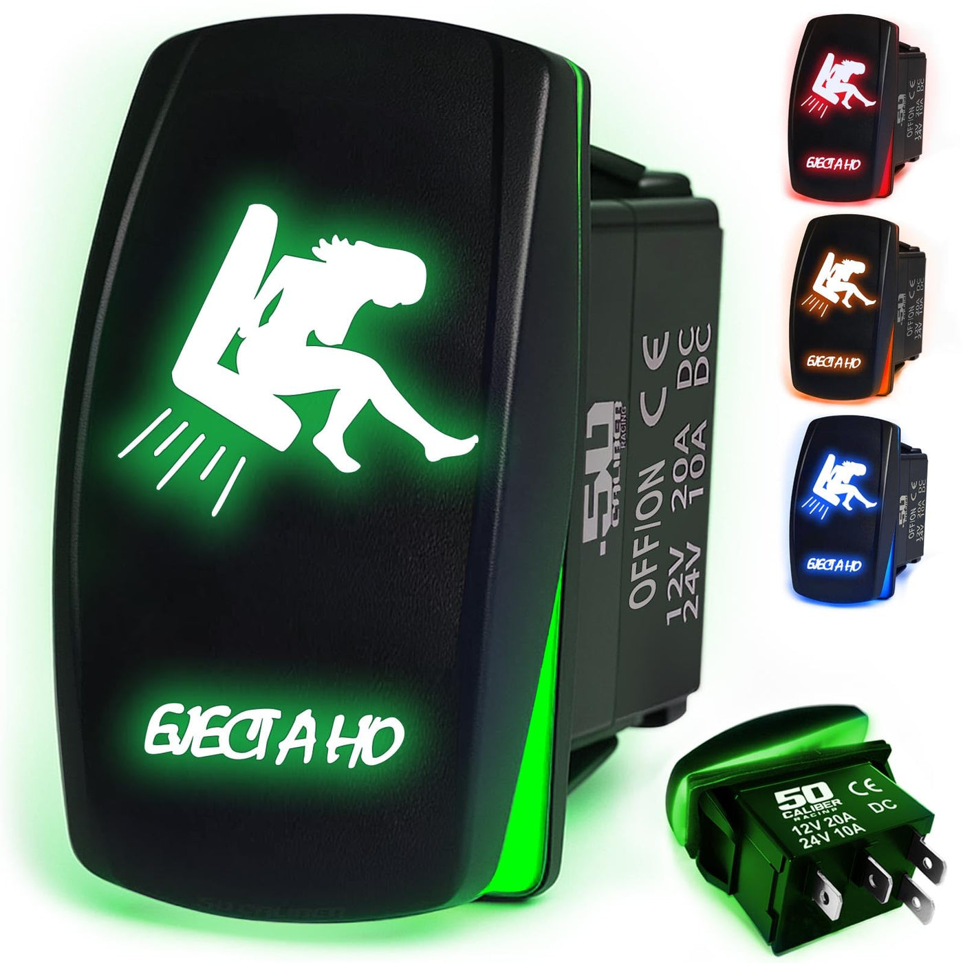 50 Caliber Racing Illuminated On/Off Rocker Switch with laser etched design - ''Eject a ho''* Green, Blue, red, and Orange Available *High quality 50 Caliber Racing LED ON/OFF rocker switch with a custom laser etched design rated for 12 Volts and 20 Amps. Two waterproof LED lights to illuminate the custom design. Rear facing spade terminals for easy wiring. Made from high impact black ABS plastic, these durable switches are perfect for your boat, car, truck, sand rail or UTV! Waterproof power switch for all your Off Road, Boating, Automotive, Racing, RV and Farm Equipment accessories:ps, P, Cameras*Universal size - dash modifications may be necessary to fitDetails:- Single Pole, Single Throw On/Off Rocker Switch- 12 Volt, 20 Amp rating- IP66 Waterproof rating- Durable ABS construction- Laser etched design- Dual LED illumination- Standard size mounting hole: 1.41'' x .86''