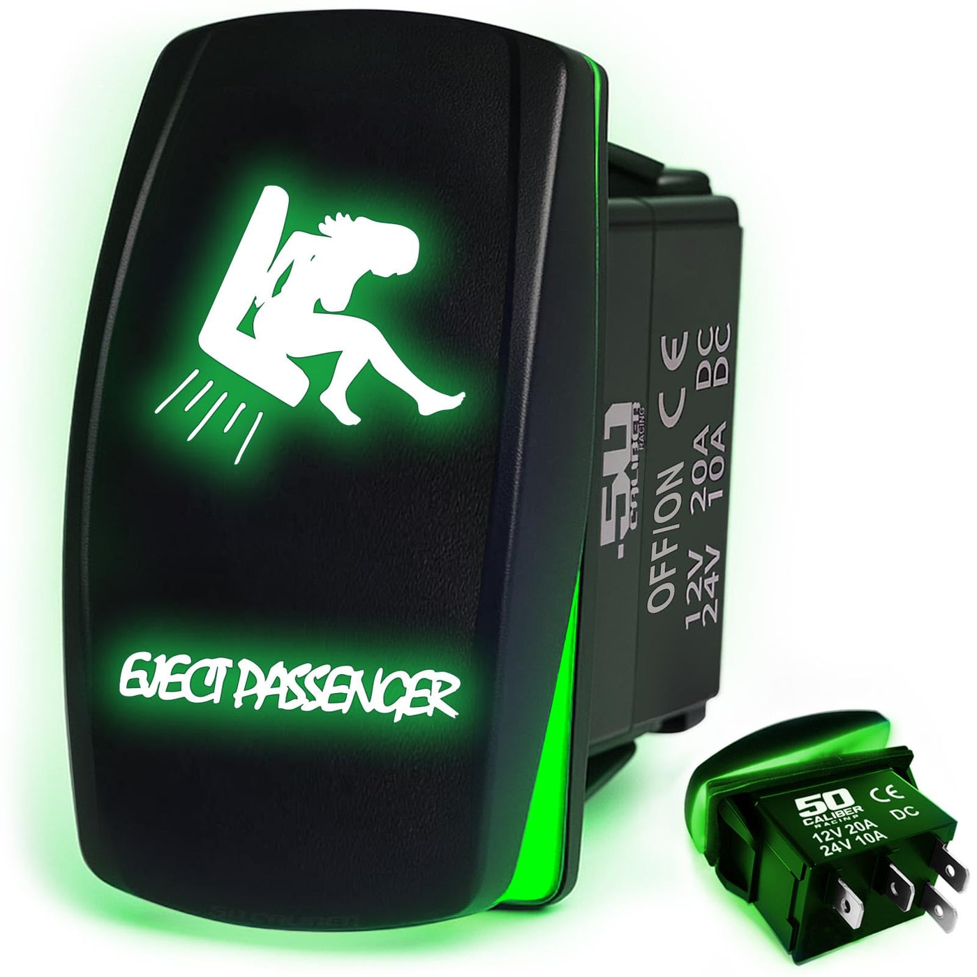 50 Caliber Racing Illuminated On/Off Rocker Switch with laser etched design - ''Eject Passenger''* Green, Blue, red, and Orange Available *High quality 50 Caliber Racing LED ON/OFF rocker switch with a custom laser etched design rated for 12 Volts and 20 Amps. Two waterproof LED lights to illuminate the custom design. Rear facing spade terminals for easy wiring. Made from high impact black ABS plastic, these durable switches are perfect for your boat, car, truck, sand rail or UTV! Waterproof power switch for all your Off Road, Boating, Automotive, Racing, RV and Farm Equipment accessories:ps, P, Cameras*Universal size - dash modifications may be necessary to fitDetails:- Single Pole, Single Throw On/Off Rocker Switch- 12 Volt, 20 Amp rating- IP66 Waterproof rating- Durable ABS construction- Laser etched design- Dual LED illumination- Standard size mounting hole: 1.41'' x .86''