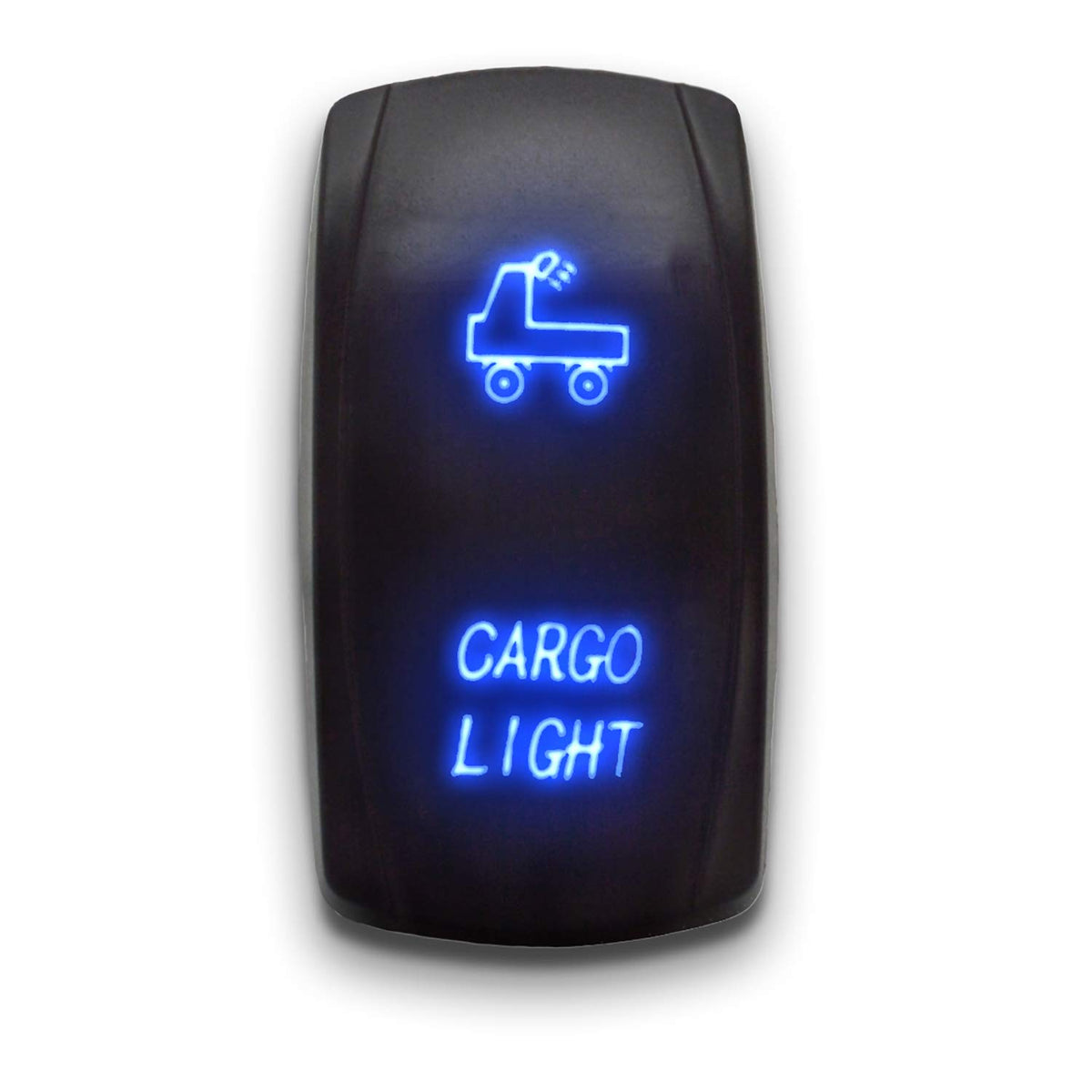 Q: What is the maximum current rating for the Cargo Lights - Blue LED Rocker Switch?A: The Cargo Lights - Blue LED Rocker Switch has a maximum current rating of 20 Amps at 12 Volts, making it suitable for various automotive and marine applications.