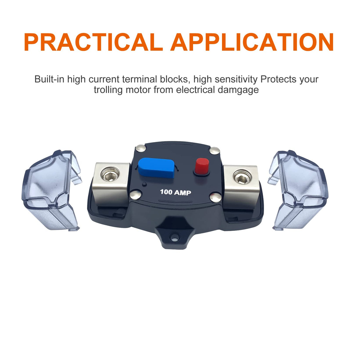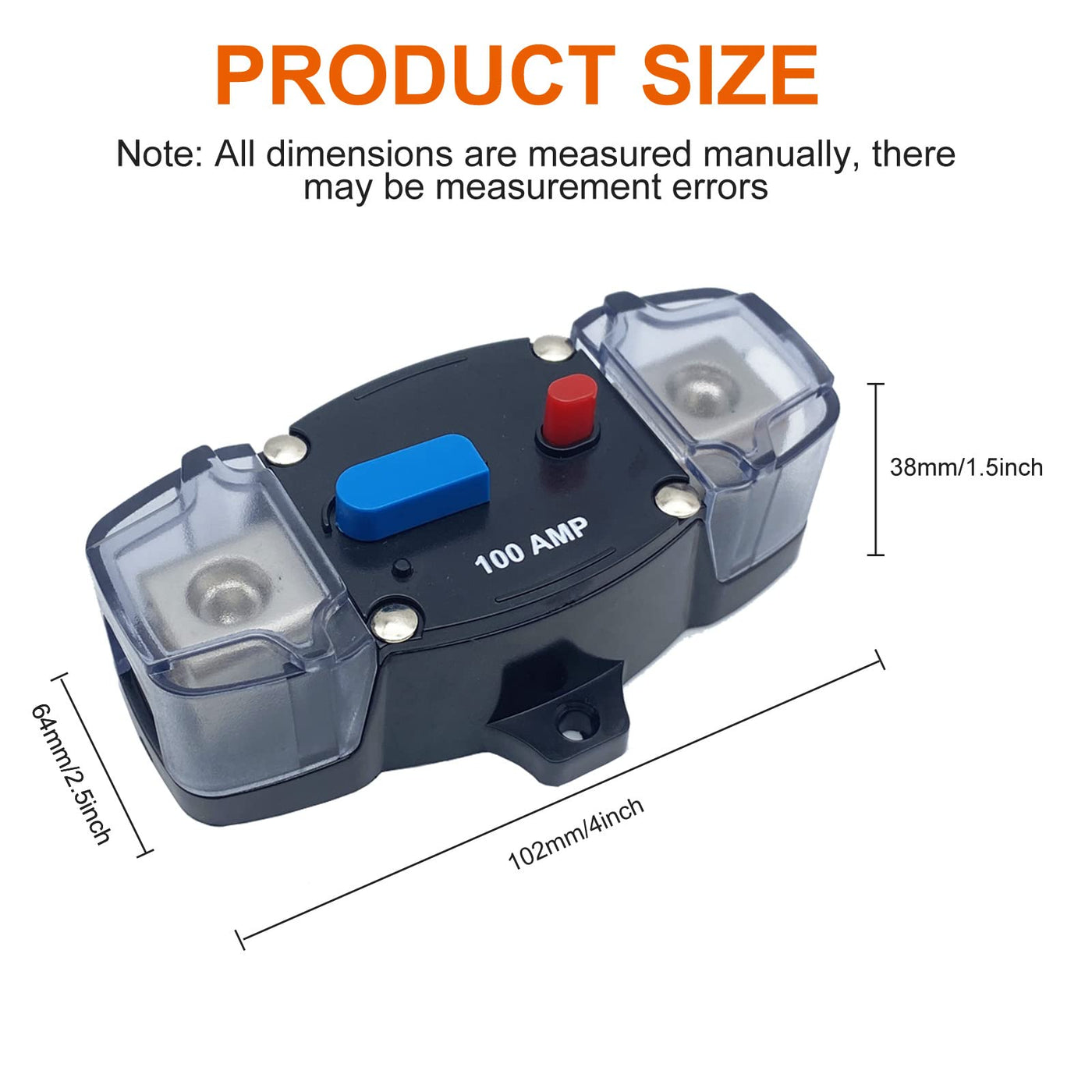 Name:Circuit Breaker Manual Reset Net weight: 174g Voltage: 12-48V DC Material: Plastic and zinc alloy steel Suit gauge wire: 0-8 AWG Operating Temperature: -10C to 50C (-14F to 122F) Size: 4.01in (L) x 2.52in (W) x 1.57in (H) Current:50A/60A/80A/100A/150A/200A/250A/300A