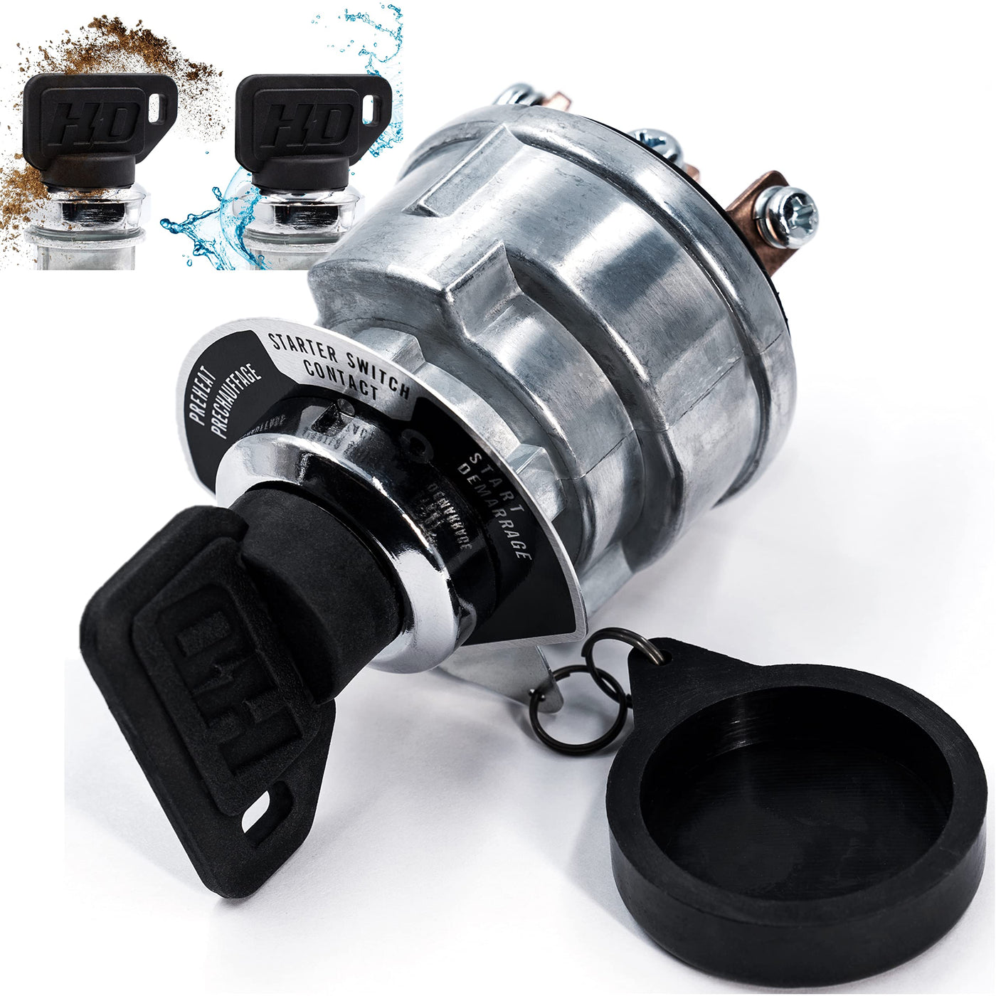 Q: What features does the HD Switch ignition key switch offer?A: This ignition key switch offers ultimate protection with a soft-grip umbrella key that safeguards against dust, dirt, and water. It includes a rubber cover to protect the key slot when the key is removed and comes with essential mounting hardware, metal spare keys, and a free carabiner keychain.