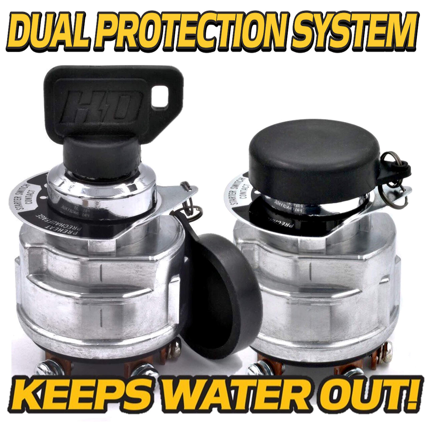 Each Ignition Switch comes with standard mounting hardware, 1 Protective Umbrella Key, 2 Spare Keys, a Tethered Storage Cap, Identification Plate, Shims, and a Free Carabiner Keychain. The HD Switch Dual Protection System Keeps dust, water and other harmful contaminates out of the ignition.
