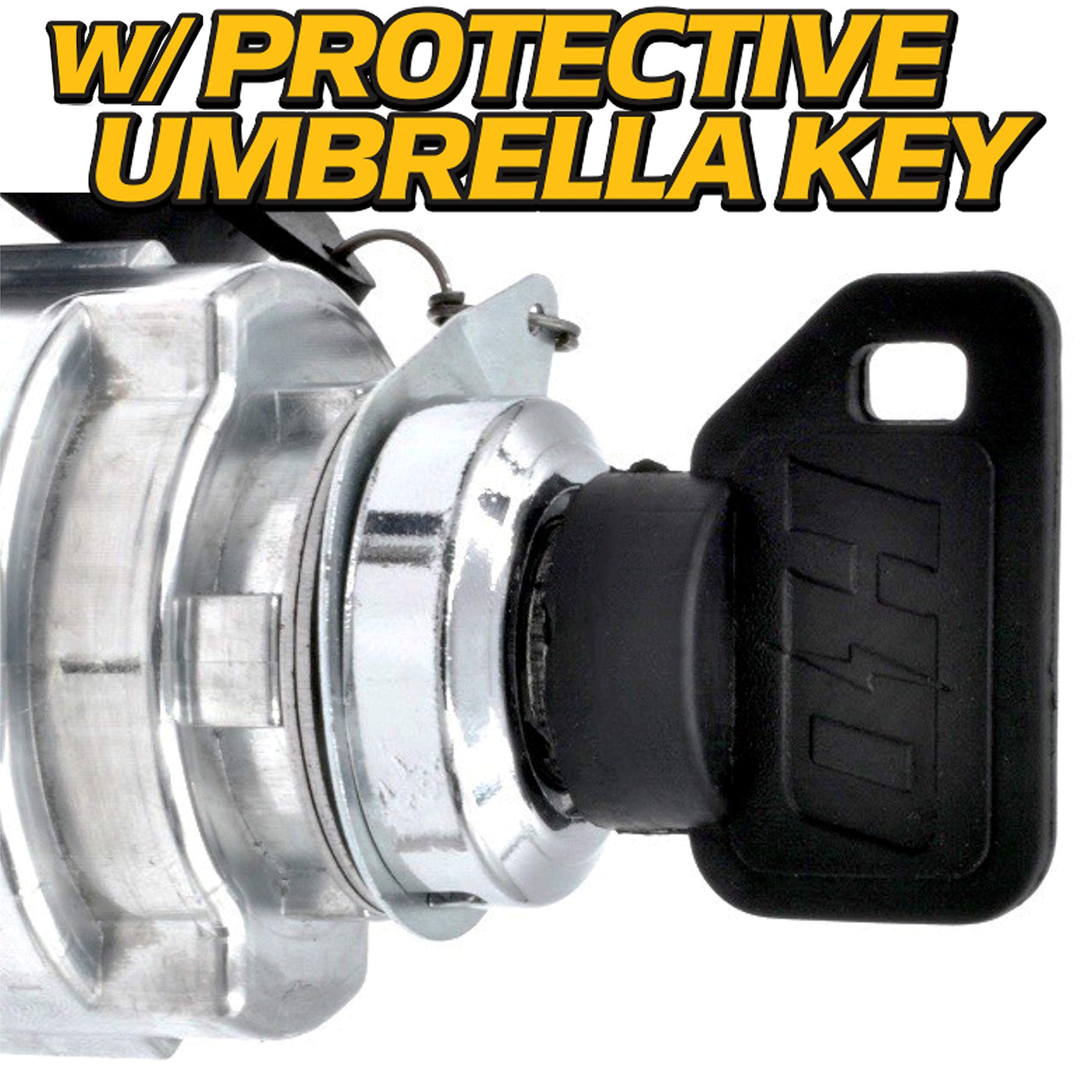 Q: What features enhance the protection of this ignition switch?A: The ignition switch includes an umbrella key that protects against dust, dirt, and water. Additionally, a rubber cover secures the key slot when the key is removed, ensuring further protection from contaminants.
