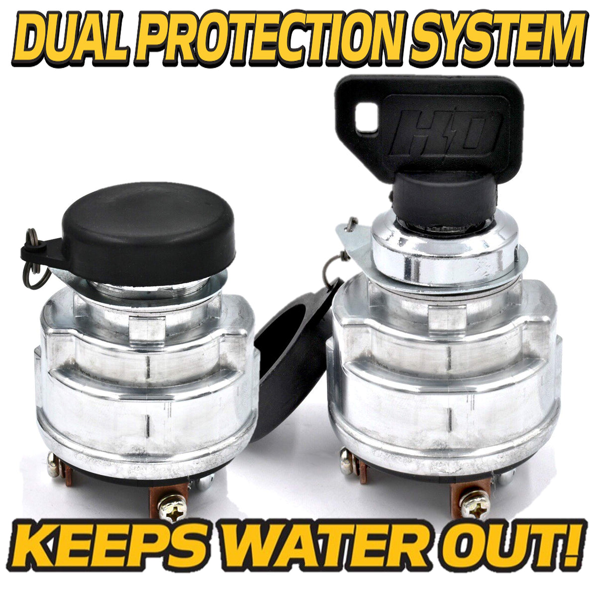 Each Ignition Switch comes with standard mounting hardware, 1 Protective Umbrella Key, 2 Spare Keys, a Tethered Storage Cap, Identification Plate, Shims, and a Free Carabiner Keychain. The HD Switch Dual Protection System Keeps dust, water and other harmful contaminates out of the ignition.