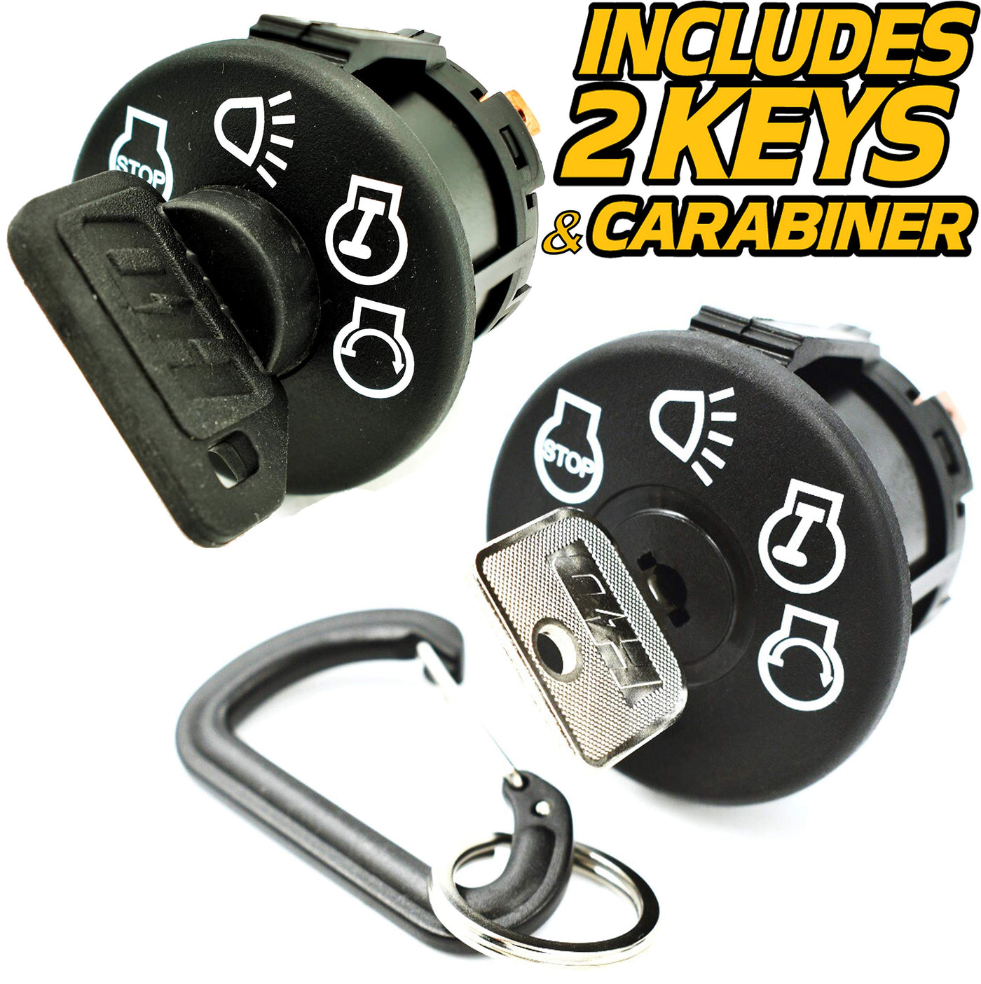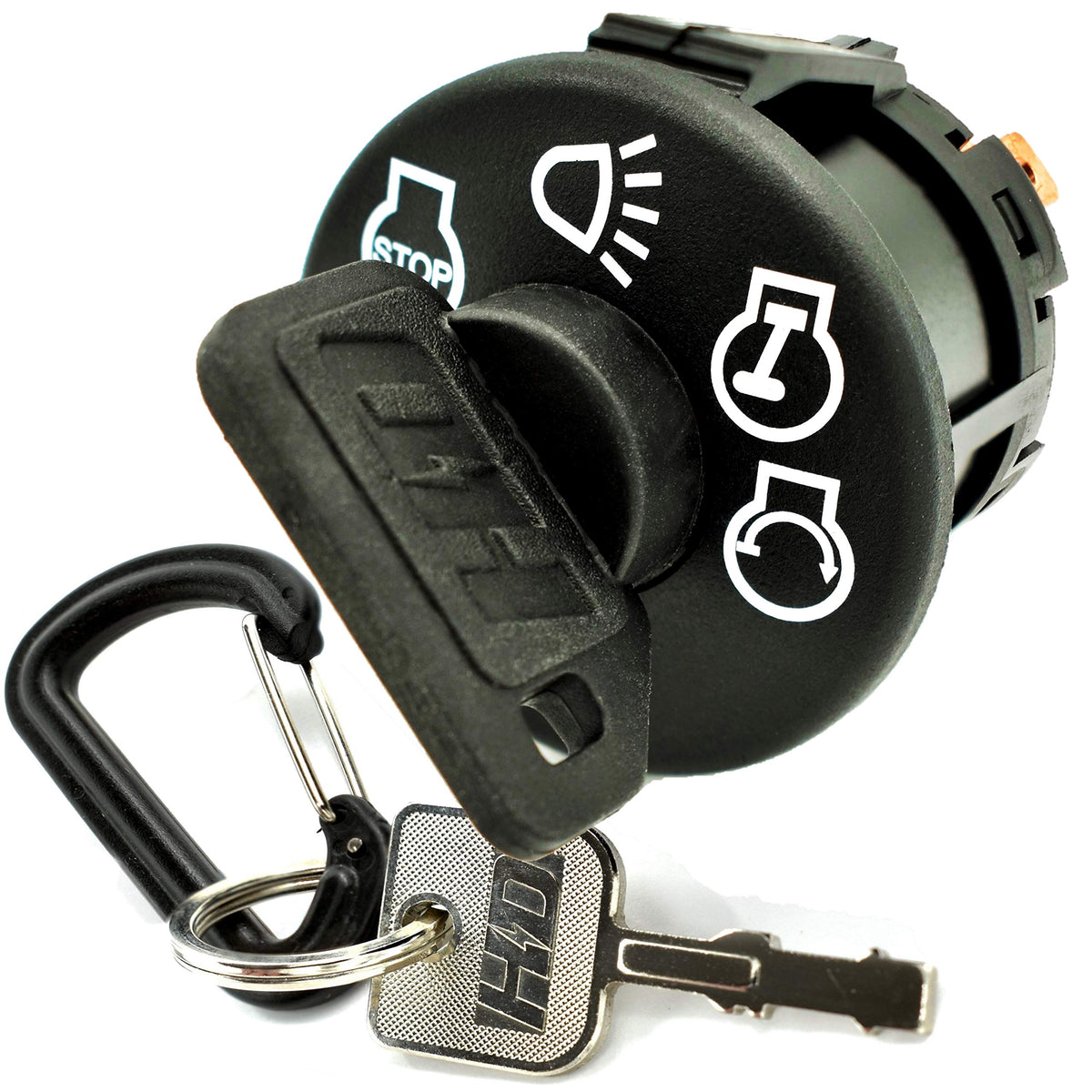 Q: Does the HD Switch include any additional keys?A: Yes, the HD Switch Starter Ignition Key Switch comes with a protective soft grip umbrella key and an additional spare metal key, along with a carabiner keychain for convenience.