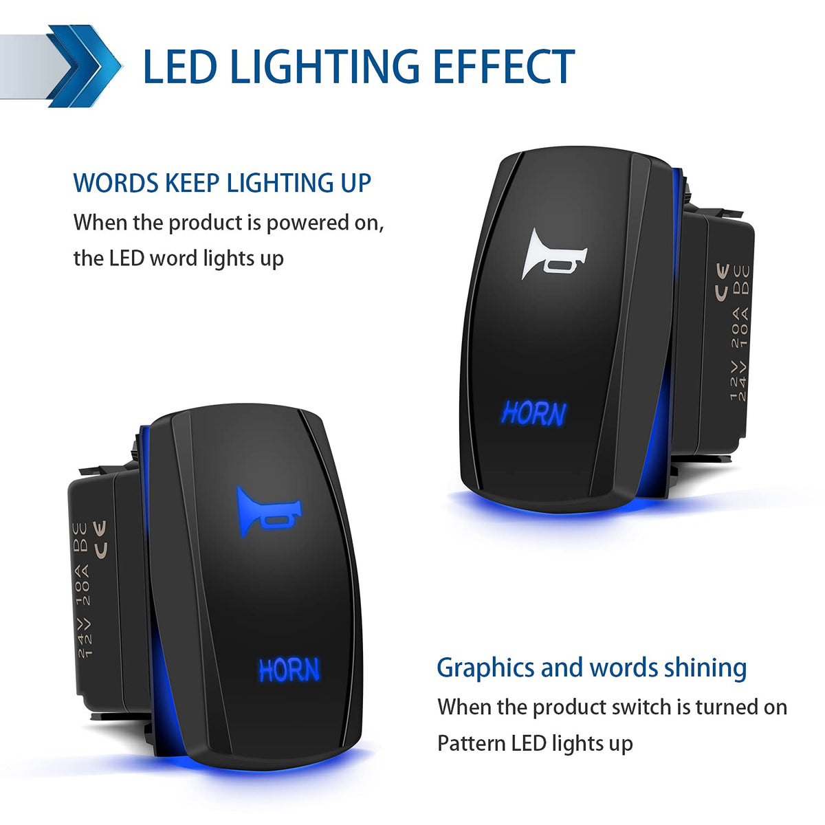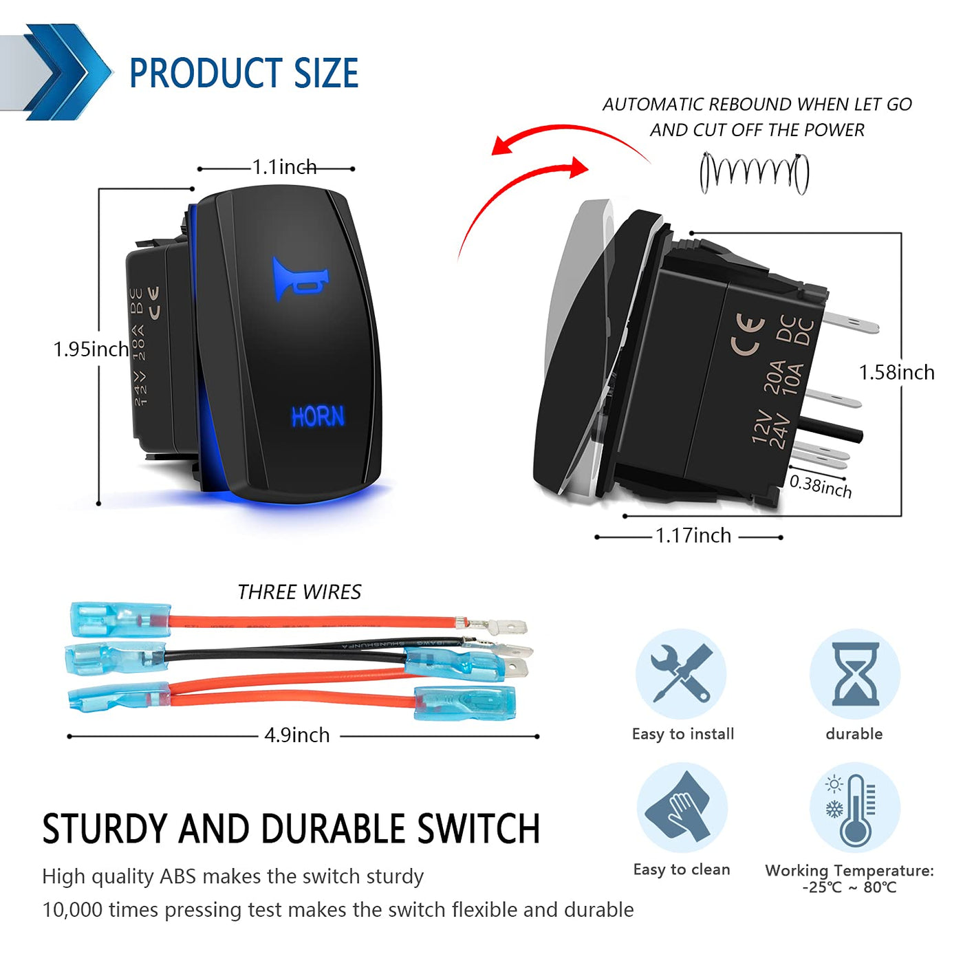 Horn Momentary Rocker Switch 5Pin Laser On/Off Blue Led Light 20A/12V 10A/24V Toggle Switch With Jumper Wires Set For Automotive