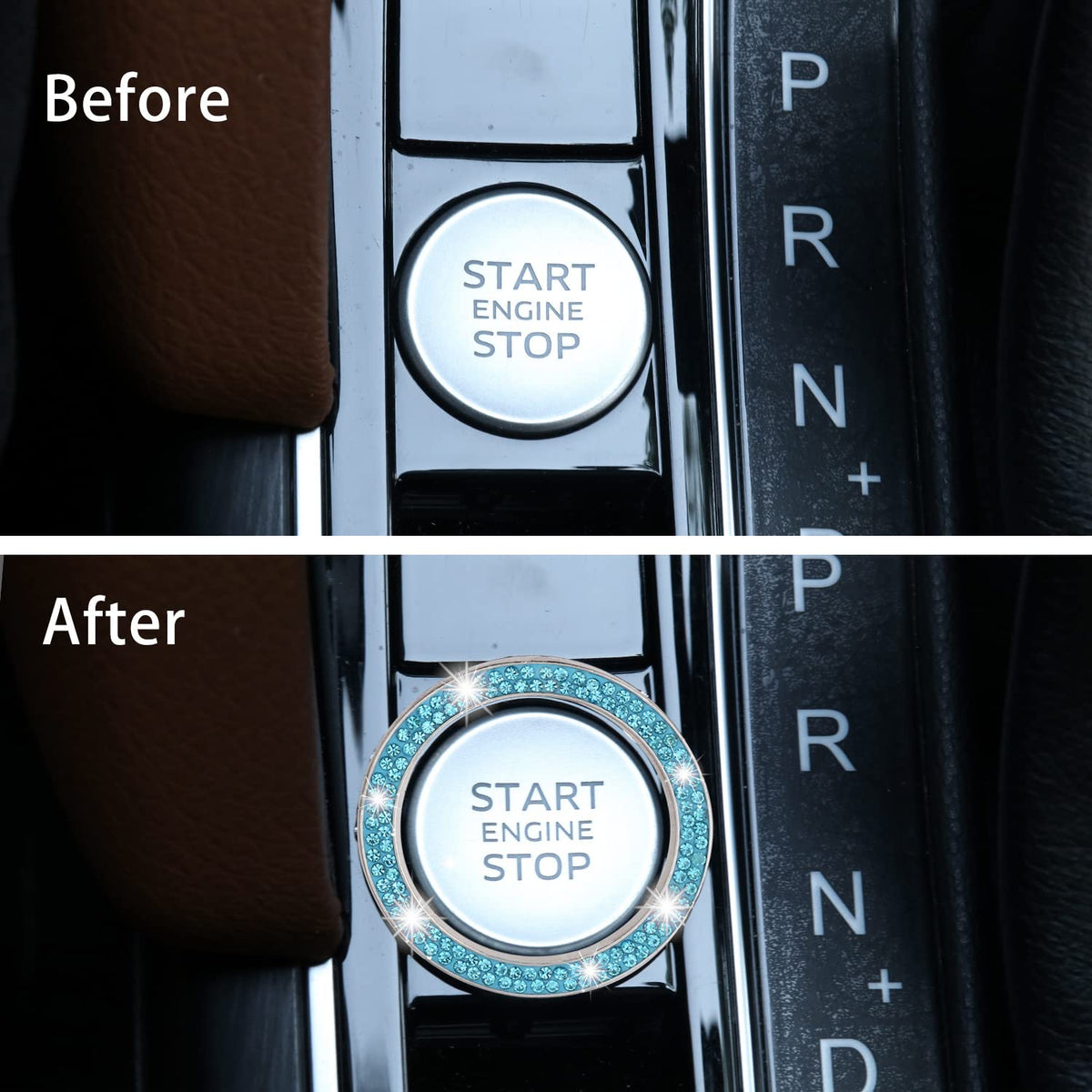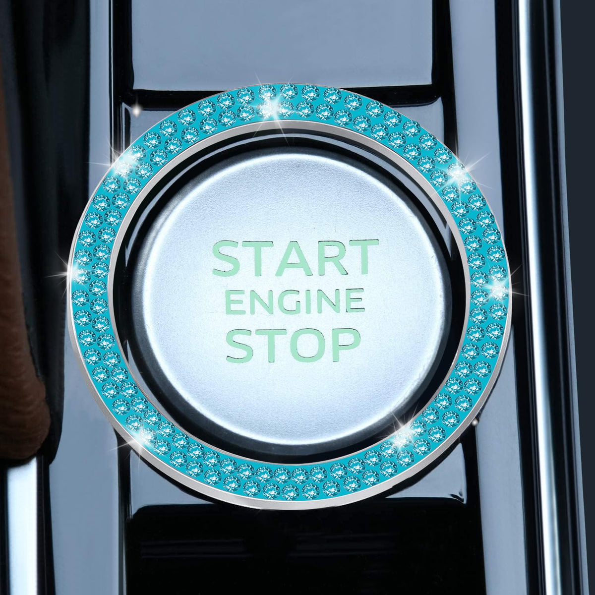Livtee 2 Pcs Crystal Double Rhinestone Car Engine Start Stop Decoration Ring, Bling Car Interior Accessories For Women, Push To Start Button Cover/Sticker, Key Ignition & Knob Bling Ring, Cyan