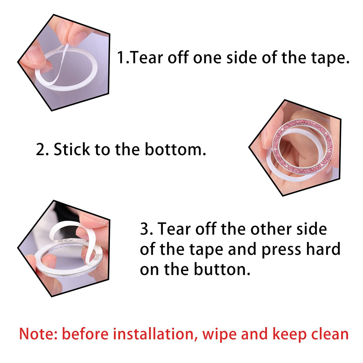 Q: How do I install the rhinestone ring on my car's push button?A: Installation is easy! Each crystal ring comes with a piece of adhesive tape. Simply peel off one side of the tape and stick it to the halo, then peel off the other side and press it firmly onto the button. For better adhesion, especially in colder weather, you can warm the adhesive with a hair dryer for about 5 seconds before applying.