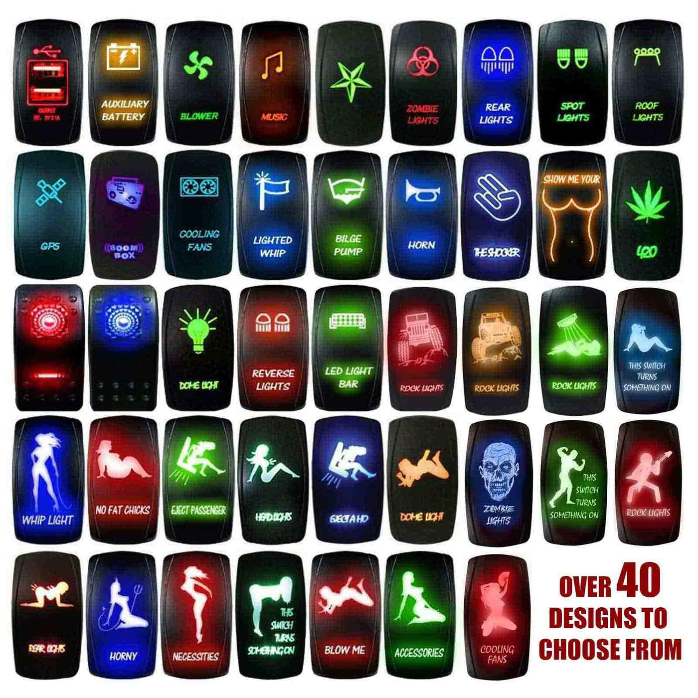 On/Off Rocker Switch toggle switch with laser etched design - ''This 12v switch turns something on''* Green, Blue, red, and Orange Available * LED On Off rocker switch with a custom laser etched design rated for 12v switches and 20 Amps. Two waterproof LED lights to illuminate the custom design. Rear facing spade terminals for easy wiring. Made from high impact black ABS plastic, these durable switches are perfect for your boat, car, truck, sand rail or UTV! Waterproof power switch for all your Off Road, Boating, Automotive, Racing, RV and Farm Equipment accessories:ps, P, Cameras*Universal size - dash modifications may be necessary to fitDetails:- Single Pole, Single Throw On/Off Rocker Switches- 12 Volt, 20 Amp rating- IP66 Waterproof rating- Durable ABS construction- Laser etched design- Dual LED illumination- Standard size mounting hole: 1.41'' x .86''