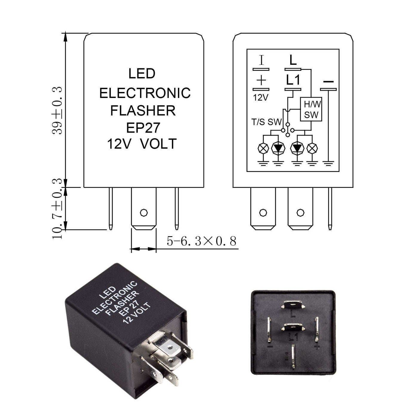 Solve Led Related Turn Signal Problems Such As Fast Blink, Flash(See Remark Below) 1)Dc 12V 2)Designed For 5-Pin Ford Mustang Cars. 3)Long Life Span 4)Plug N' Play Directly (Check Your Origin Relay In Car, Usually Located In Fuse Box) 5)Made In Taiwan 6)Universal Part No. Ep27 Flash Speed Issues For Signal/Turn Light Application-- Normally When You Flip Your Turn Signal Switch, The Light Blinks At A Set, Slow Pace. However, If You Have Modified Your Lights To Use Leds, You'Ll Notice That The Turn Signals Now Blink Very Quickly. This Is Caused By The Low Resistance Of The Leds Due To The Fact That They Use Less Energy. To Correct The Problem, You'Ll Need To Wire The Turn Signals In A Parallel Circuit. To Do This, You'Ll Be Installing A Resistor Or Control Flasher. (Here It Is!)