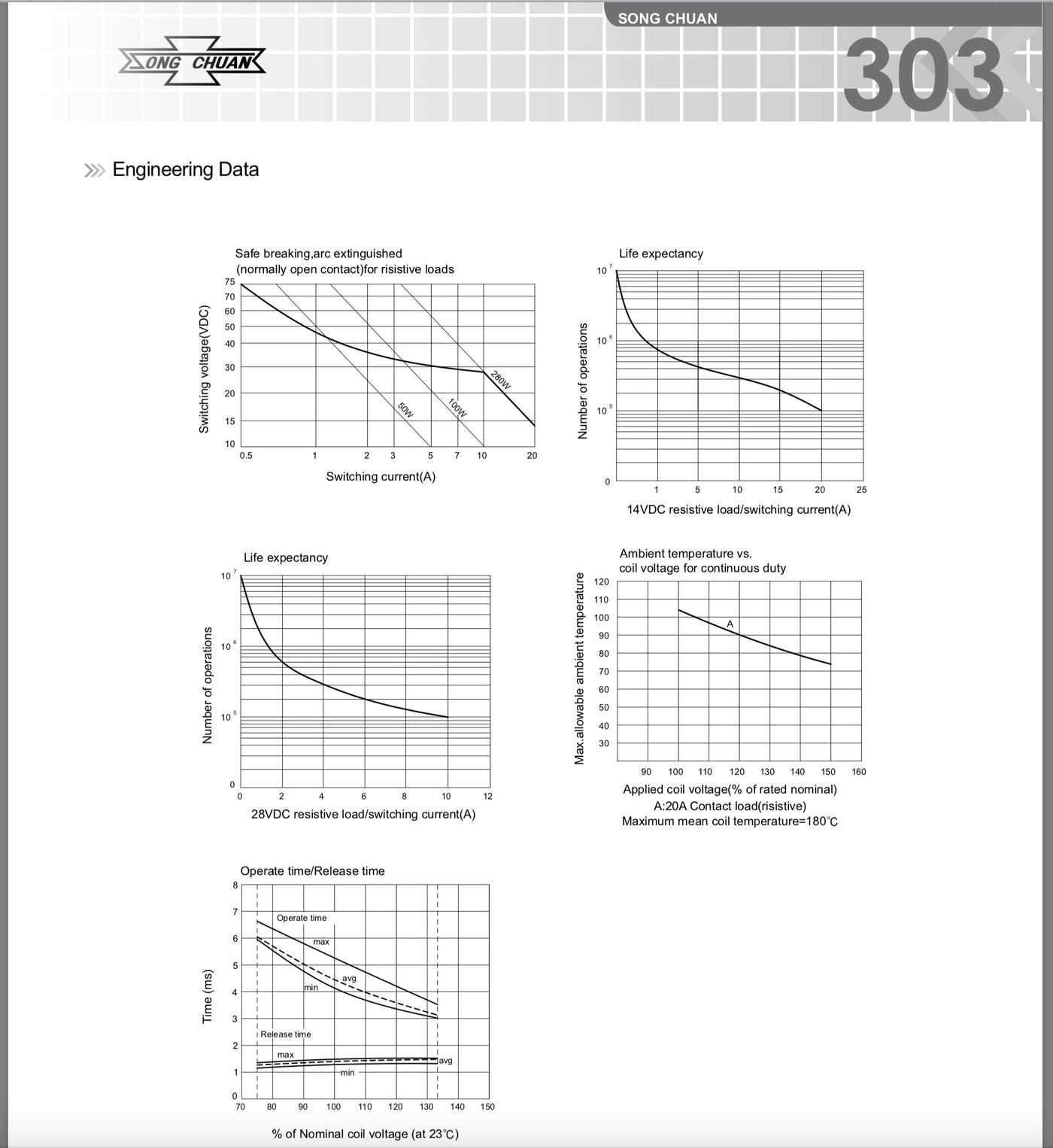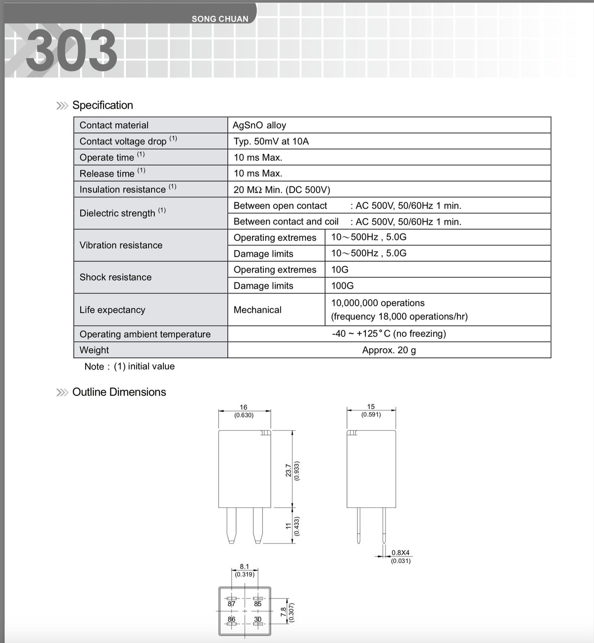 Q: What is the power rating of the relay and its specifications?A: This relay has a high rating of up to 20A and operates at 12 VDC. It features a contact form of SPST (1 Form A) and has a power consumption of 960 mW. Additionally, it can withstand high temperatures of up to 125°C ambient.