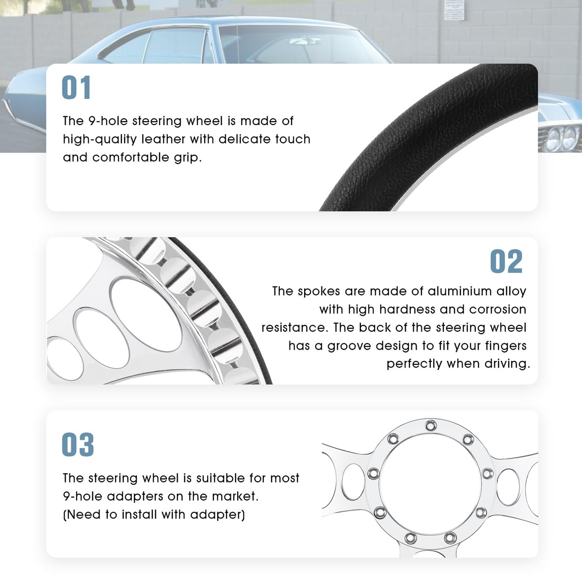 QYMOPAY 9 Bolt Disc Steering Wheel, 14'''' Leather billet steering wheel, 3-Spoke Steering Wheel with Holes, Fits most 9-hole ca