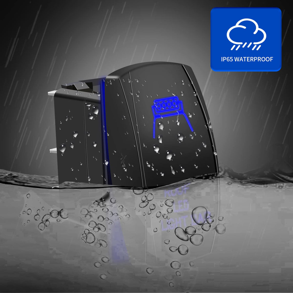 Specification:5 pin on-off rocker switch with 14 AWG jumper wires.Material: ABS+PCWaterproof: IP66Rated at 12V 20A and 24V 10A DC.SPST design (Single Pole Single Throw).Built-in 2 LEDs, laser-etched pattern, Blue LED Backlit.Product Size: 1.9''(48.3mm) x 1.04''(26.3mm).Mounting Hole Size: 1.43''(37mm) x 0.84''(21.3mm).Mainly used for controlling LED light bar, LED work lights, fog lamps, driving lights, headlights, taillights, off road lights, boat light, etc.Package Include:1x 5 pin rocker switch1x jumper wires set