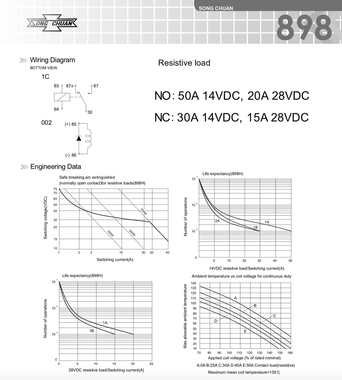 Q: What is the maximum contact current rating for this automotive relay?A: The maximum contact current rating for the Song Chuan 898H-1CH-D1SW-R1 automotive relay is 50A.