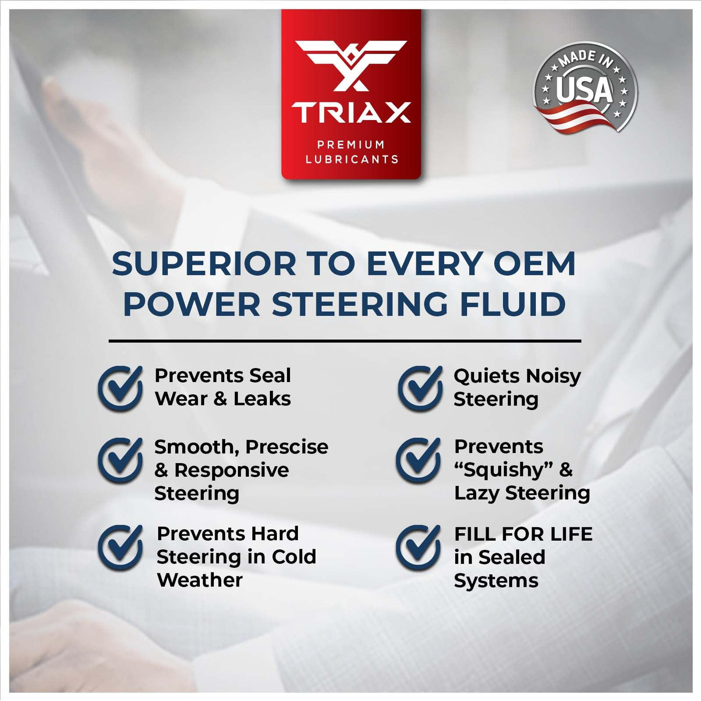 Q: How does TRIAX OEM Grade PSF prevent power steering leaks?A: TRIAX OEM Grade PSF contains seal conditioners that revitalize seals within the power steering system, preventing them from drying or shrinking, thereby reducing the risk of leaks.