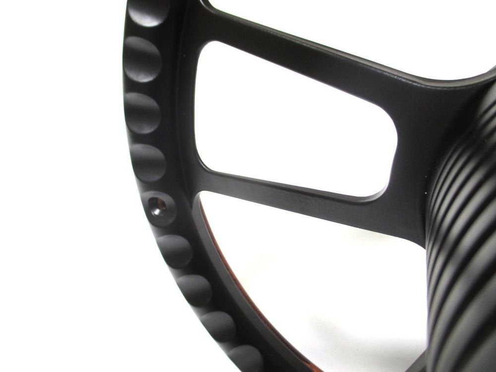Q: What material is the steering wheel made from?A: This steering wheel features a half-wrapped design with real dark Mahogany wood, while the backside is constructed from durable black billet aluminum.