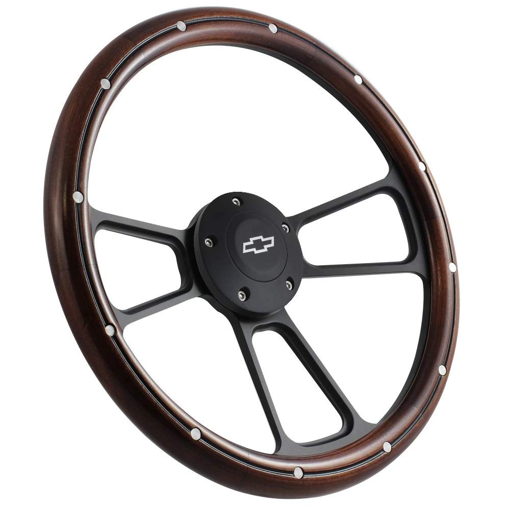 Our Best-Selling Steering Wheel! This cool wheel is half-wrapped with real dark Mahogany wood. The backside of each wheel is black billet aluminum and features a machined smooth and comfortable finger indentation for grip.It looks amazing in any muscle or classic car or truck and the feel of it is phenomenal! The horn button is made of black billet aluminum and engraved with the Chevy Logo You will need an adapter for your wheel.Kit includes : Steering Wheel Black Billet Engraved Chevy Horn Button Part no. 1099-SPRB-CH Dimensions: Diameter: 14" Dish Depth: Approx. 2" 5 hole wheel bolt measurement (hole-to-hole): 1.6"