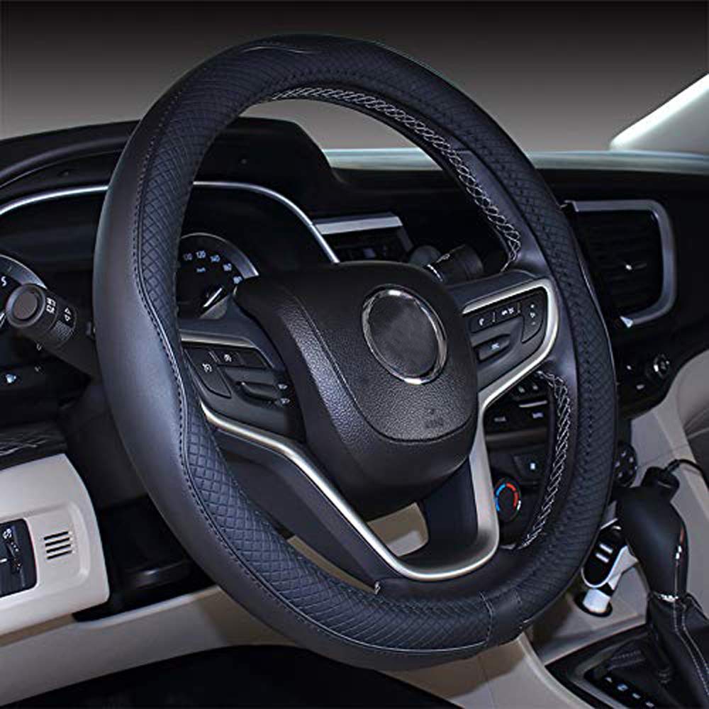 Q: What materials are used in this steering wheel cover?A: The steering wheel cover is made from premium microfiber leather with a natural rubber inner ring, providing durability, anti-slip features, and breathability for comfort.