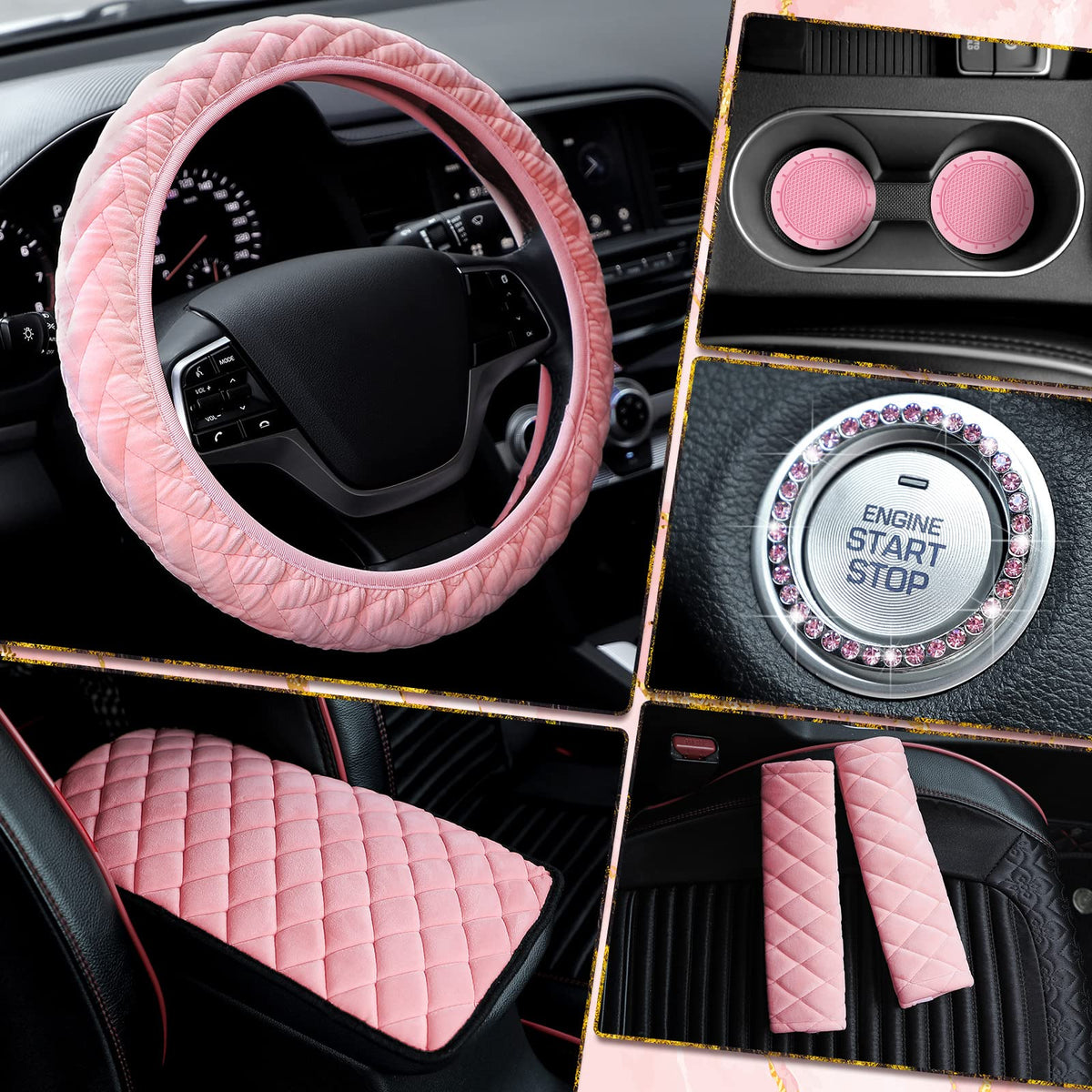 Q: What materials are used in the 8 Pcs Pink Cute Car Accessories Set?A: The car accessories set includes a plush steering wheel cover, silicone car cup coasters, a PU leather auto center console pad, aluminum alloy and rhinestone bling start button ring stickers, and plush auto seat belt covers.