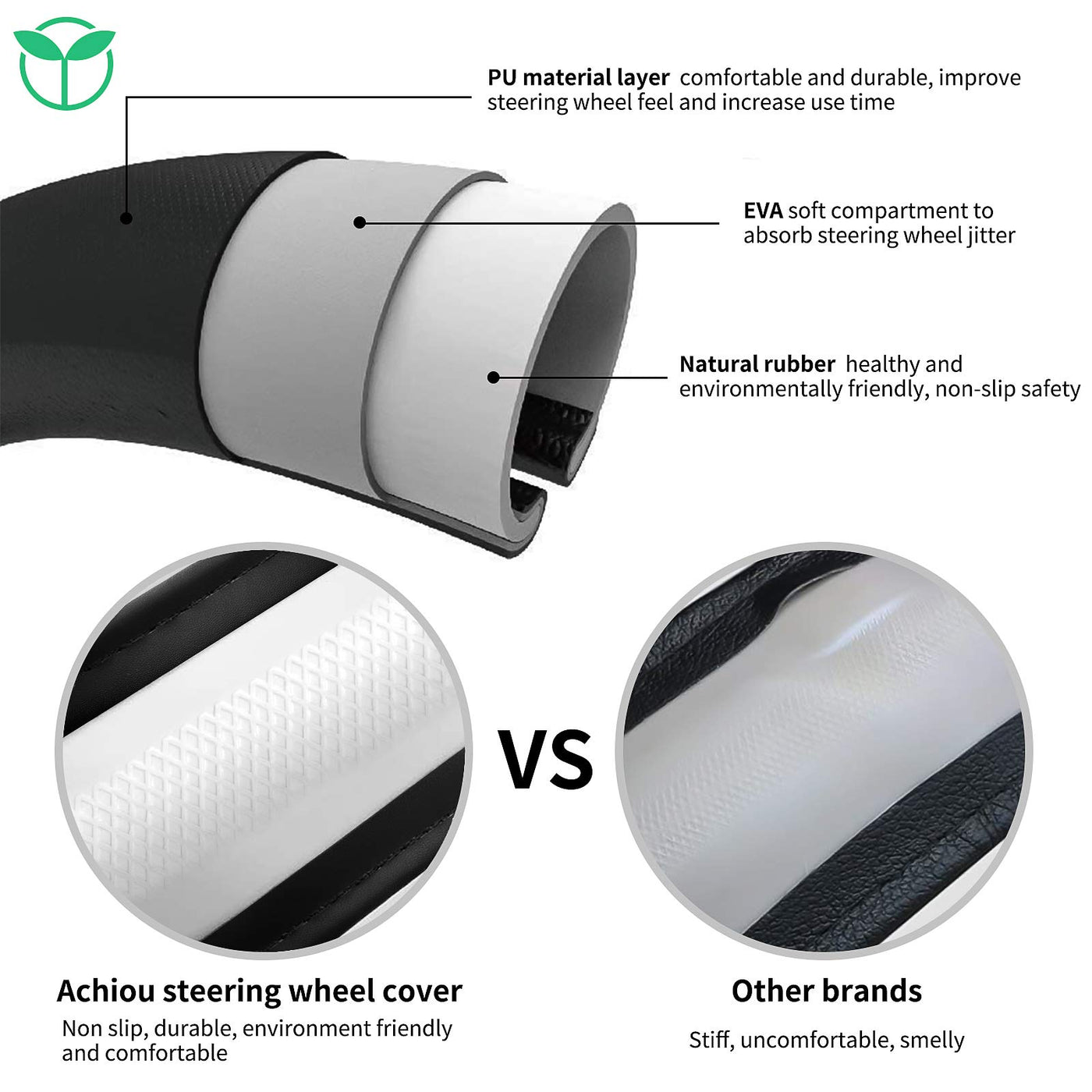 Q: How does the Achiou steering wheel cover enhance driving safety?A: The ergonomic design of the Achiou steering wheel cover provides a comfortable grip that increases driving confidence. Its anti-skid properties help reduce slippage, ensuring better control while driving.