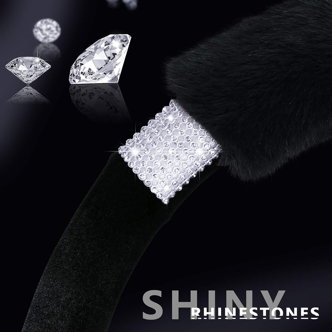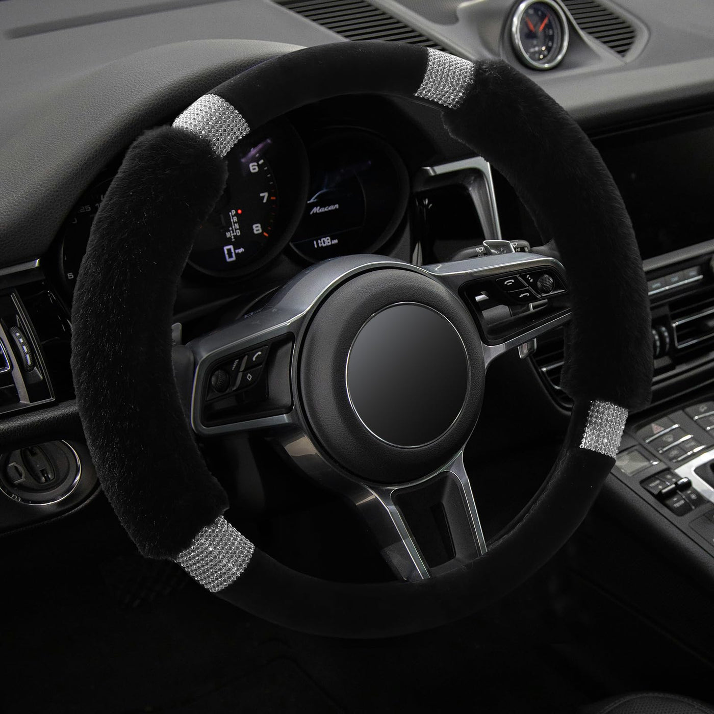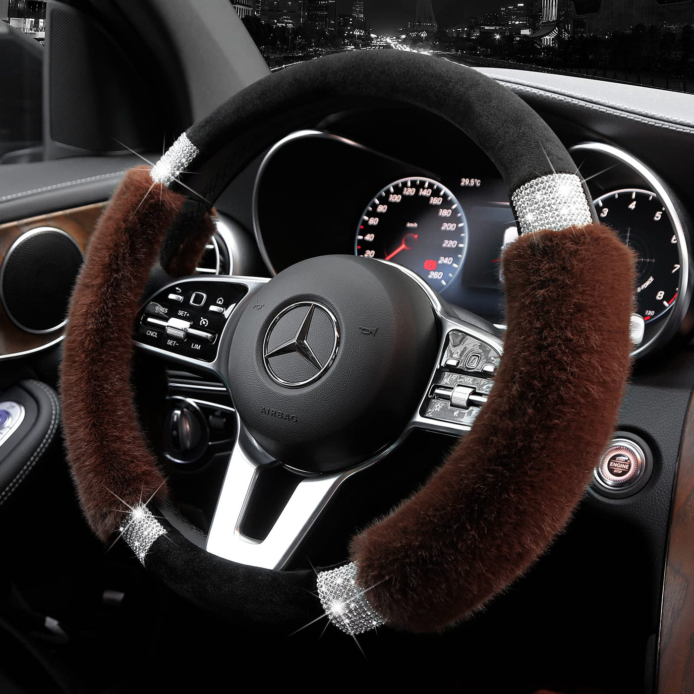 Achiou Rhinestone Fluffy Steering Wheel Cover - Comfortable Non-Slip Luxury Faux Wool, Universal Fit for 14.5' to 15' Steering Wheels