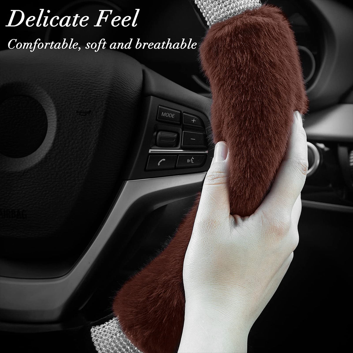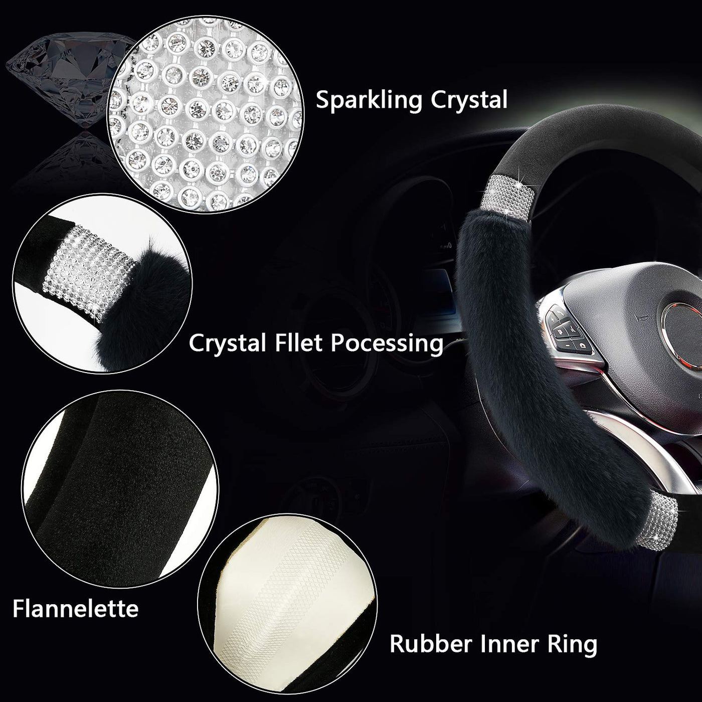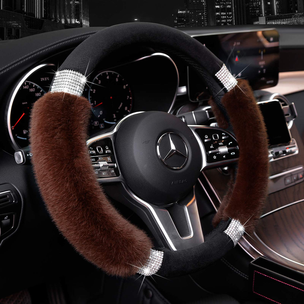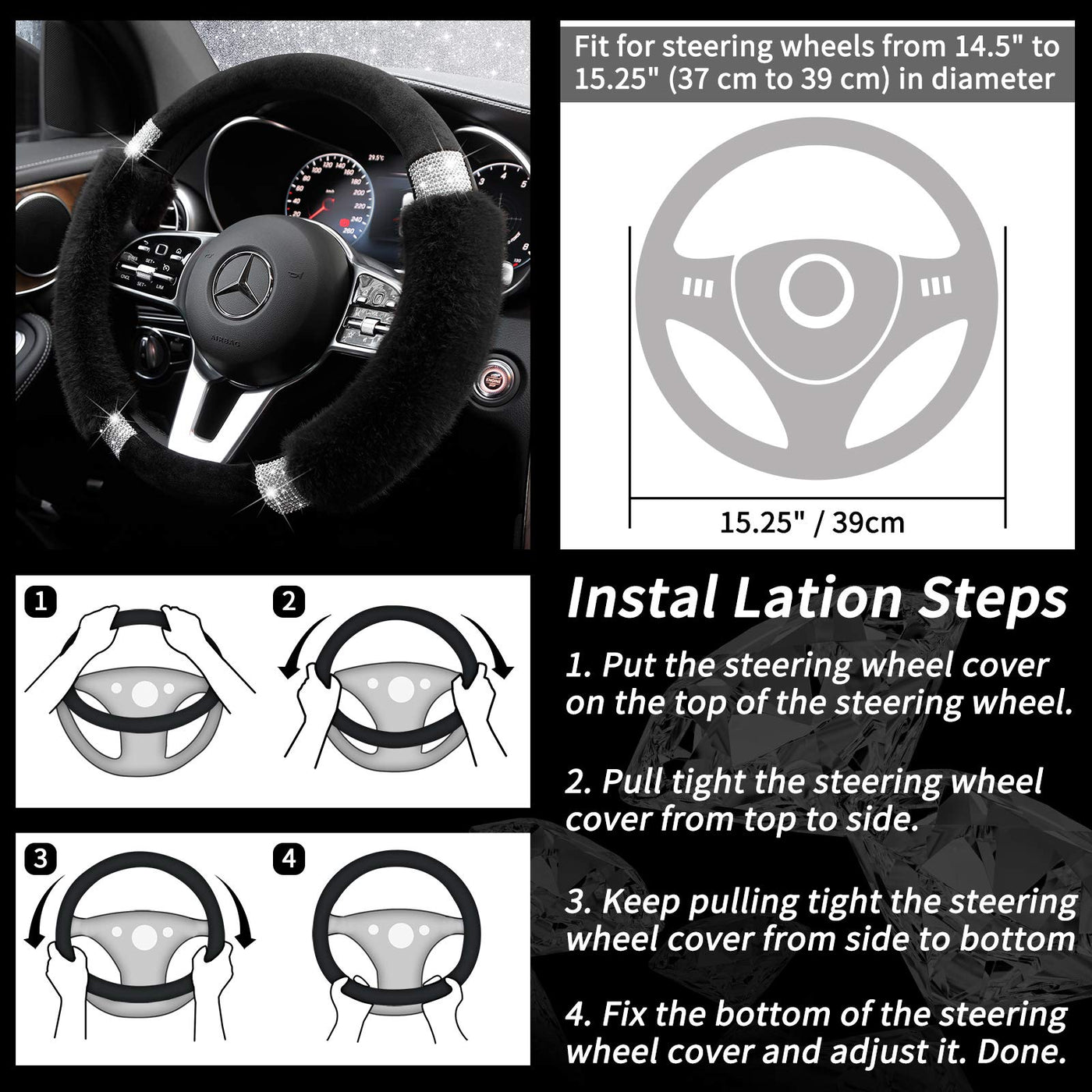 Achiou Rhinestone Fluffy Steering Wheel Cover - Comfortable Non-Slip Luxury Faux Wool, Universal Fit for 14.5' to 15' Steering Wheels